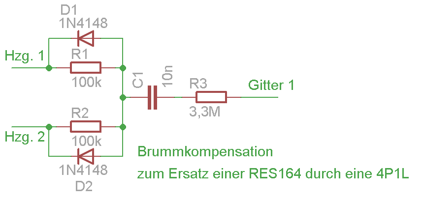 Das Brummen konnte ich erheblich verringern. Ich setze ja, wie geschrieben momentan eine 4P1L als Ersatz für die RES164 ein. Im Forum von *(I)* *(I)* ist vor einiger Zeit intensiv über diese Röhre diskutiert worden, vor allem über ihre Eigenschaft ein deutliches 100Hz-Brummen zu erzeugen. Genau dieses hatte ich auch bemängelt und es schien unabhängig von den Siebmitteln im Anodenspannungszweig zu sein. Somit kam nur Zweiweggleichrichtung der Heizspannung in der Röhre selbst in Frage. Ich habe nach einer Möglichkeit gesucht, dieses Brummen auf einfache Art zu kompensieren, ohne das Radio zu modifizieren. Durch Einbau von 6 zusätzlichen Bauteilen in den Umsockler (genaugenommen habe ich es zwischen die Steckstifte gelötet - der Umsockler ist vergossen) konnte ich das Brummen nachhaltig verringern. Geblieben ist ein leichtes höherfrequentes Brummen, dass wohl auf einer Oberwelle der 50 / 100 Hz liegt, aber nur unwesentlich stört. Mit dem Brummverhalten bin ich nun trotz der "Ersatzröhre" zufrieden.