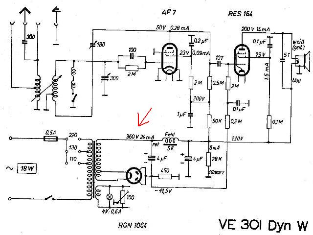 2 Leitungen zu Lampe, AF7 Heitzung und zum Fang-gitter der RES 164 (das stimmt laut Klaus's aussagen) 2 weitere Leitungen zu RGN Heitzspannung (das stimmt laut Klaus's aussagen) 1 weitere Leitung zum 4uF Kondensator der wiederum an der RGN liegt (müsste stimmen) 1 Leitung die direkt zum Entbrummer angeschlossen ist, andem auch 450 Ohm (????) und die Erdung für den Lautsprecher liegen = (also Erdung vom Entbrummer)