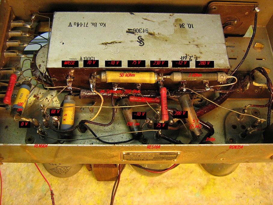 Vom Netzschalter aus: nach 110V > 34Ohm; nach 150V > 41Ohm; nach 220V > 98Ohm Anodenspannungswickel: 1260Ohm Heizwickel: je ca. 1Ohm