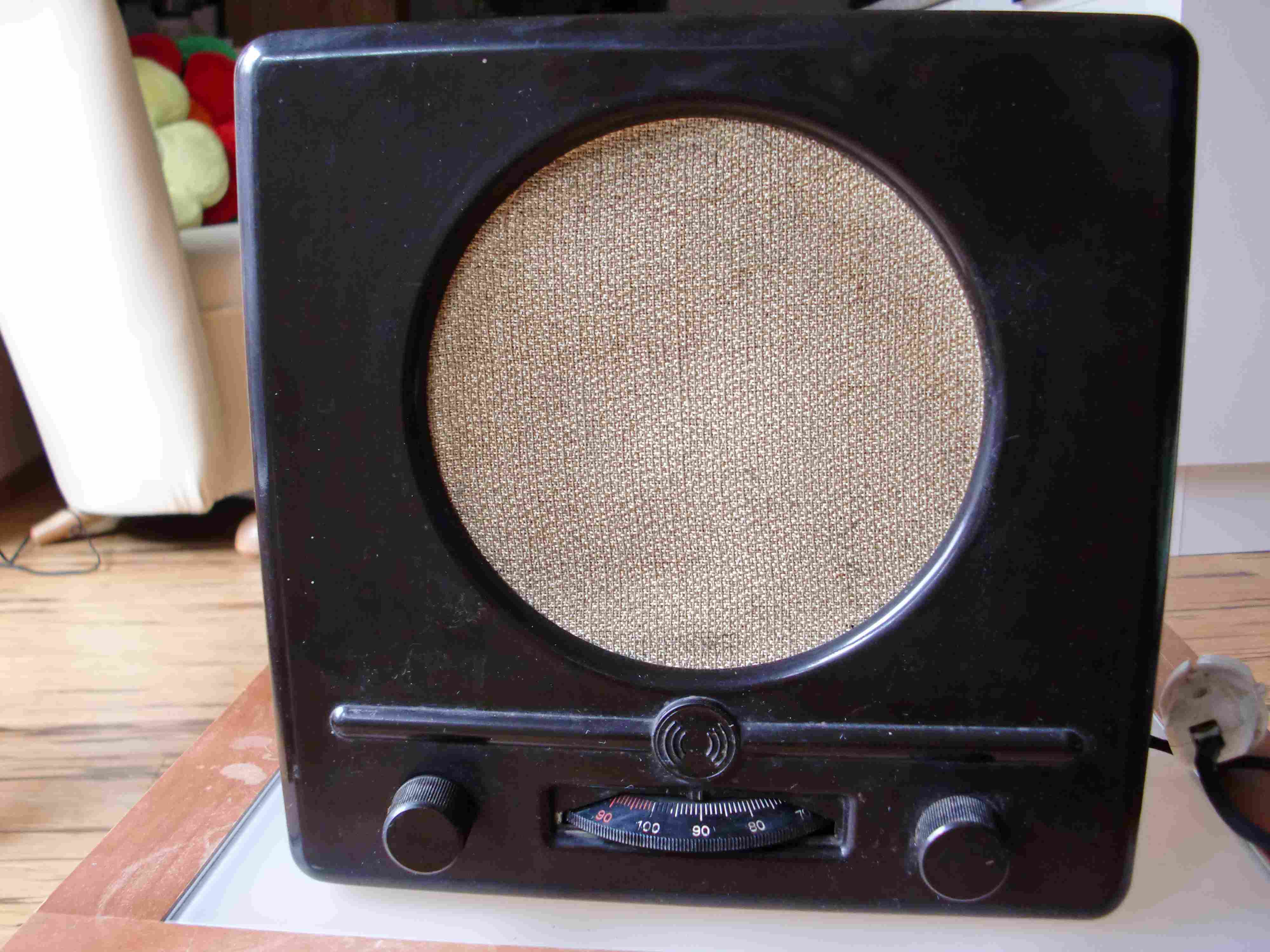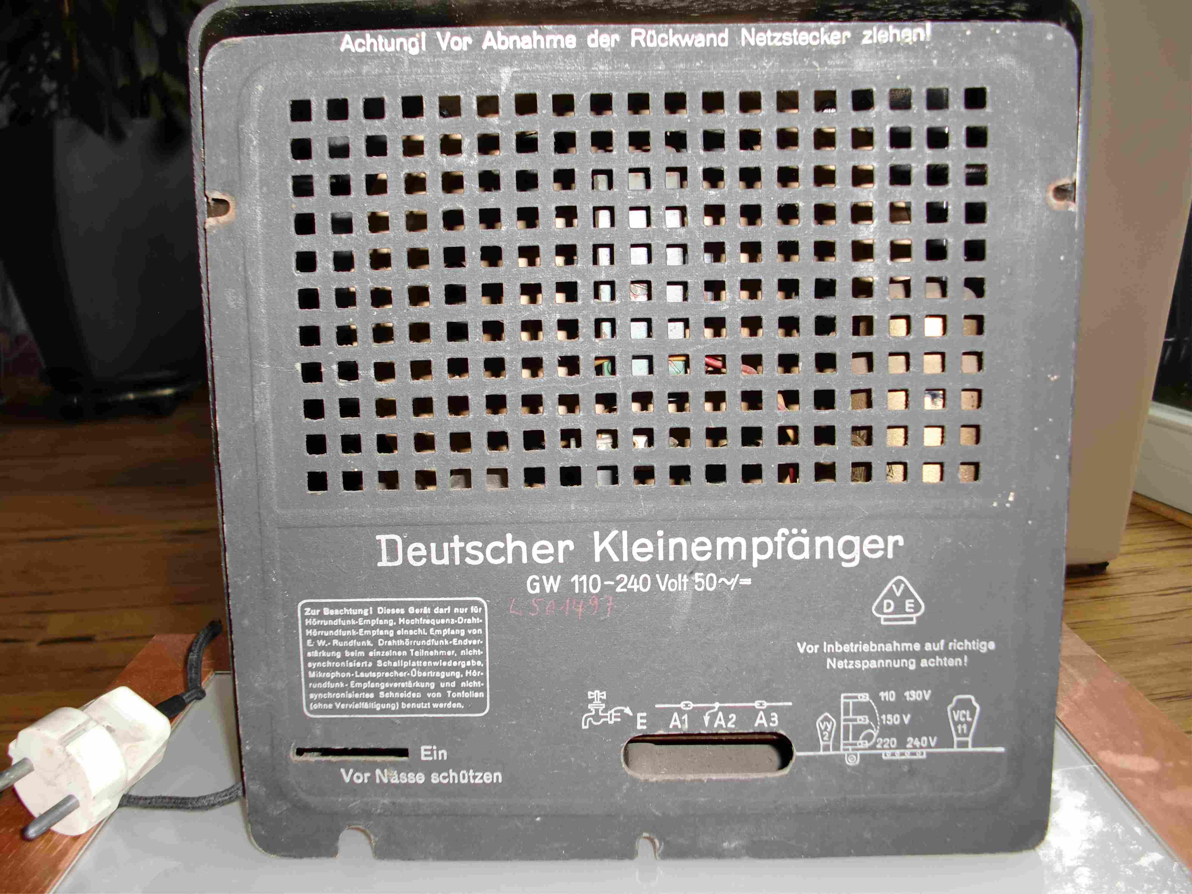 der Gehäusfront nach zu urteilen kann es sich nur um ein Gerät aus der Nachkriegsproduktion handeln. Indiz: Das Emblem aus Reichsadler und XXX-Kreuz ist durch eine Schallwellen-Symbolik ersetzt worden. Auch die Rückwand deutet darauf hin. Das Vorkriegsgerät trug dort die Bezeichnung "Deutscher Kleinempfänger 1938".