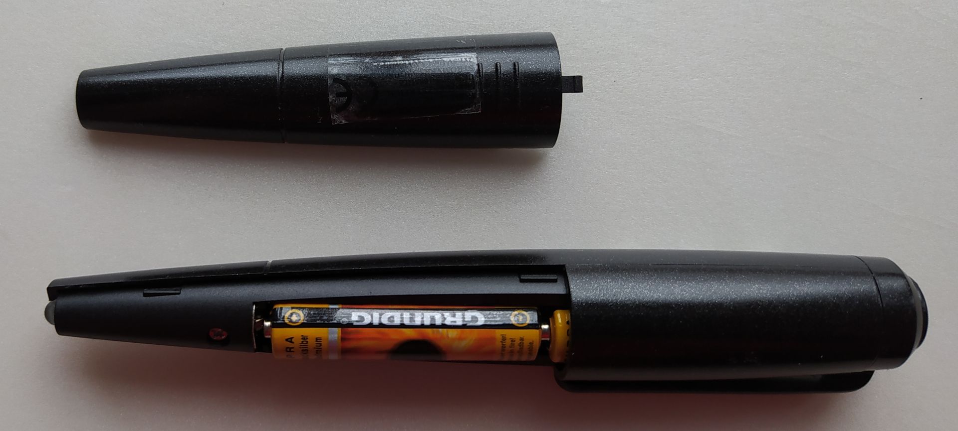 beim aufräumen ist bei mir mal wieder ein verschollenes UKW-Radio aufgetaucht. Leider kann ich keinen Hersteller finden. Auf dem Stift steht nur Model PA-13. Ich vermute, es kommt aus China. In dem Stift befindet sich eine Glühlampe und am anderen Ende eine Buchse für einen Kopfhöreranschluss(Mono). Betrieben wird das 'Gerät' mit zwei 1,5V Batterien. Einen Schalter gibt es nicht. Angeschaltet wird der Empfänger durch einstecken des Kopfhörers. Es gibt schon merkwürdige Kombinationen, wie z.B. einen Toaster mit UKW Radio.