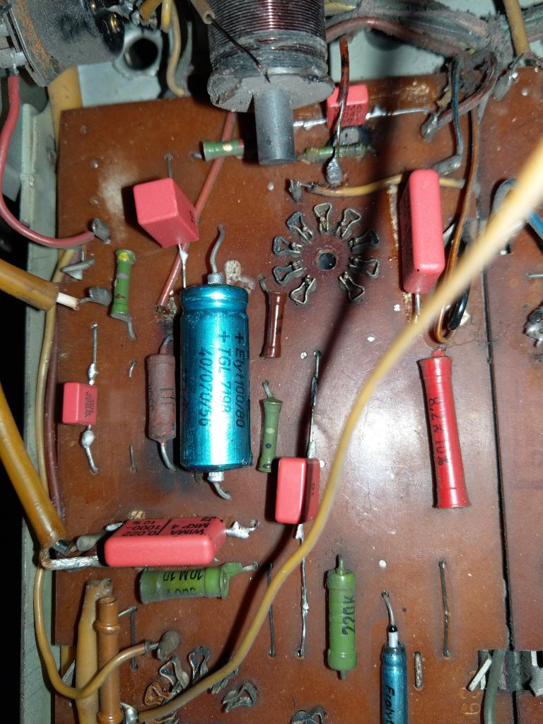 Ergänzung: Ich sehe auf dem Foto noch 2 Problemkondensatoren auf der VK-Platine, rechts oben ist noch ein kleinerer Gewaplastkondensator und ca. in Bildmitte, links neben den 3 diagonal angeordneten roten Kondensatoren ist noch ein modern anmutender Kunstharzvergossener Kondensator, der aber auch problembehaftet ist und auf jeden Fall rausmuß !
