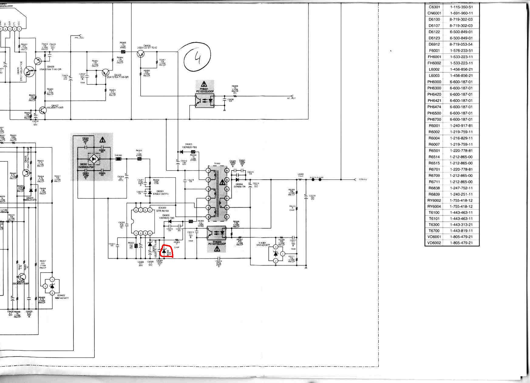 Das Gerät macht gar nichts. Standby Spannung liegt nicht an. Im Stanbynetzteil ist ein IC STR-A6169 verbaut. Hinter dem Gleichrichter liegt am IC Spannung an. An Pin2 des ICs (Vcc) messe ich 3,8V. Das ist bestimmt zu wenig. Keine Ahnung was hier normal ist. Alle Dioden und Vorwiderstände im Umkreis sind OK (mit Multimeter gemessen). Da das 6169 etwas beschlagen von oben aussah, habe ich dieses IC neu bestellt und gewechselt. Ohne Veränderung. Danach ist mir aufgefallen, dass die Zehner Diode D6306 (Zwischen Pin 2 und Masse) nicht mehr da ist. Vielleicht ist sie in der Werkstatt ausgebaut worden. Die fehlende Diode ist im Plan rot eingekreist.