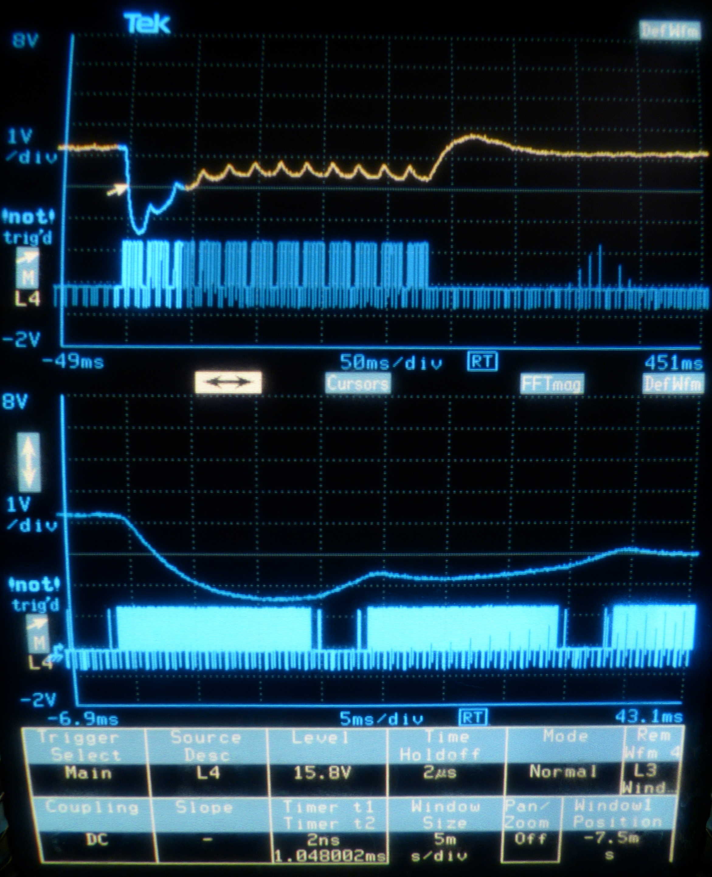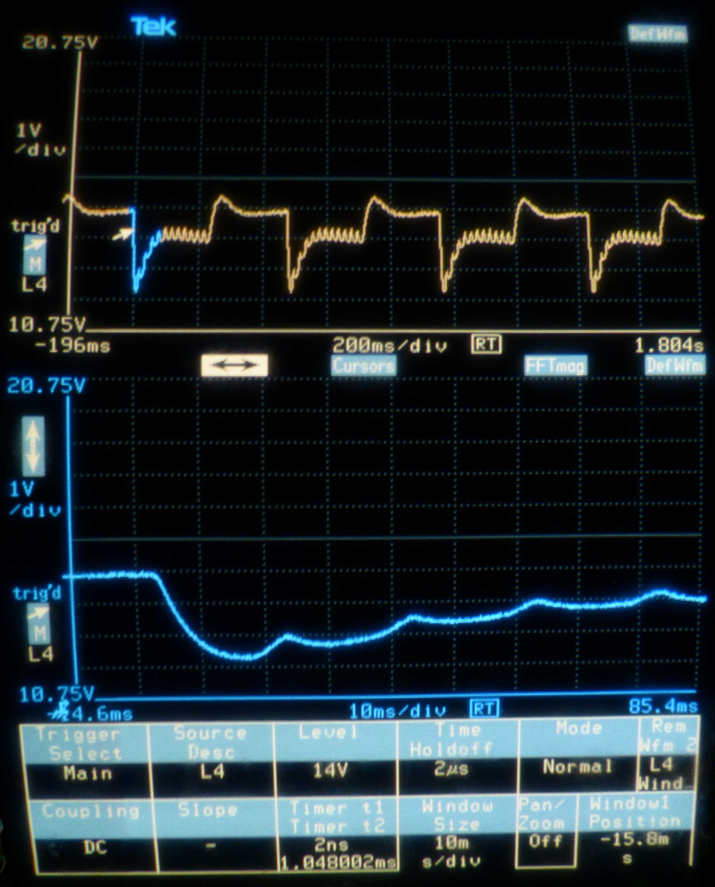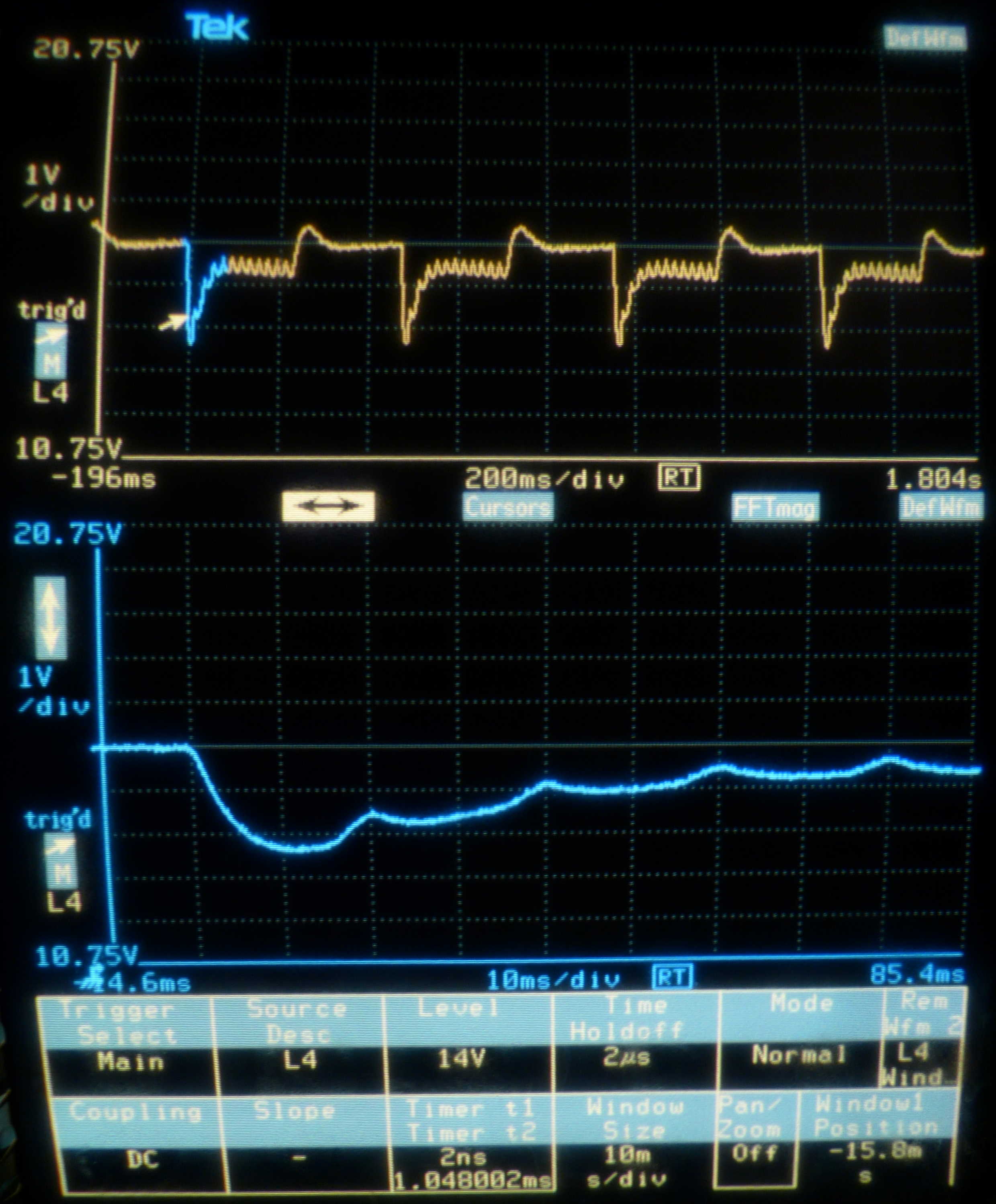 Eigenartigerweise bricht die Spannung beim ersten Hell-Bild stark zusammen um sich dann in den folgenden Bildrücklaufen, aber auch während des Bildaufbaus, wieder zu erholen. Wenn das Dunkel-Bild kommt gibt es einen deutlichen Überschwinger.