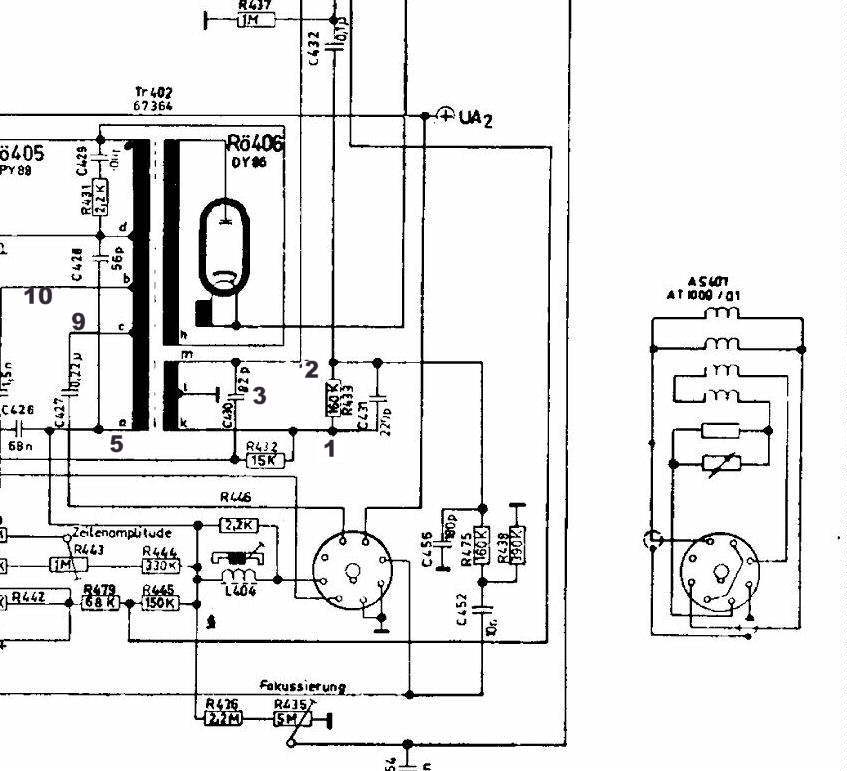 Im Anhang findest Du einen Auszug der Unteransicht des Zeilentrafos ÜHA73 und einen Teilausschnitt der Horizontalablenkung des Gerätes F261. In beiden Darstellungen sind die Anschlüsse mit Ziffern bezeichnet. Die Anschlußklips für die Boosterdiode und für die Endstufe sind nicht bezeichnet, weil sie eindeutig sind. Schau Dir bitte die Zeichnungen an und überprüfe sie an Hand Deiner Unterlagen.