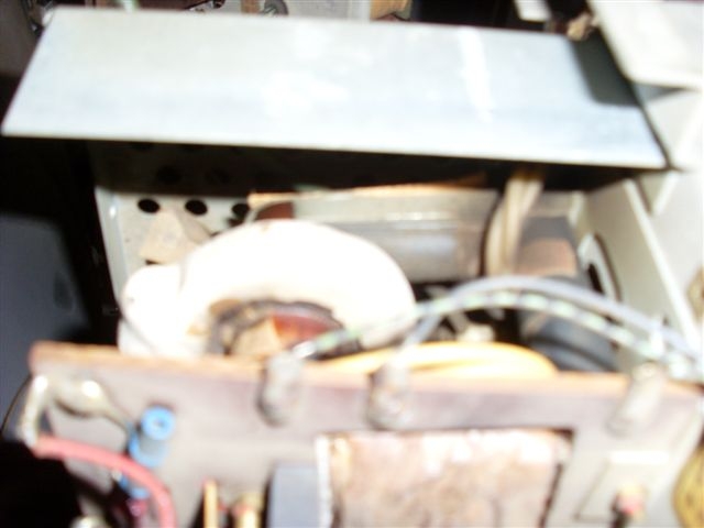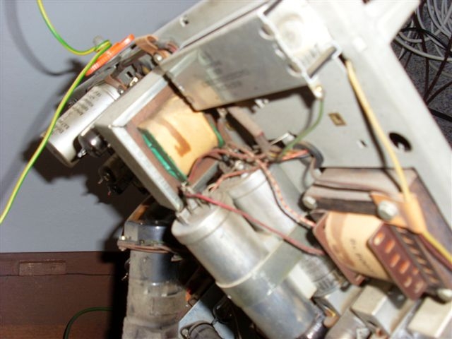 Dieser Trafo auf der Chassis innenseite ist mal ersetzt worden,man sieht es an den Lötstellen und geflickten Drähten. Erinnert mich irgendwie an Philips,die waren auch oft so schwarz,fast wie mit Teer überzogen.... [img][/img]