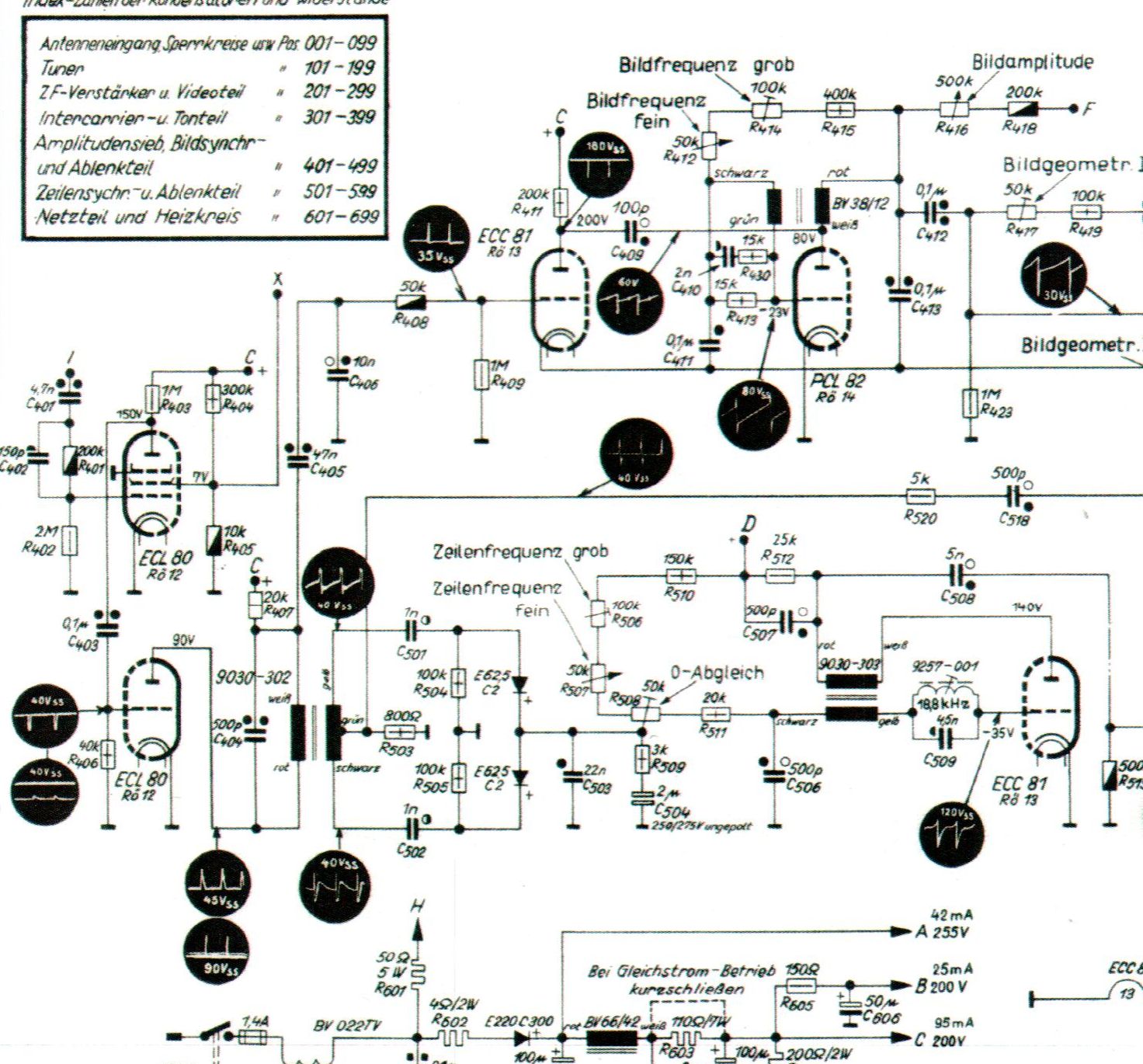 Mach in Ruhe... Du hast beste Voraussetzungen. Wenn Du absolut nicht weiterkommst, kannst Du auch mal probieren, die Werte nach eigenen Überlegungen zu ändern, im Synchronisierteil kann da nicht viel schiefgehen, alles ordentlich dokumentieren und ggf. zurückändern. Wenn z.B. die Impulse vor C409 o.k. sind, können da ruhig auch mal 200pF ... 1nF rein, Spannung beachten, 630V sollte da genommen werden.