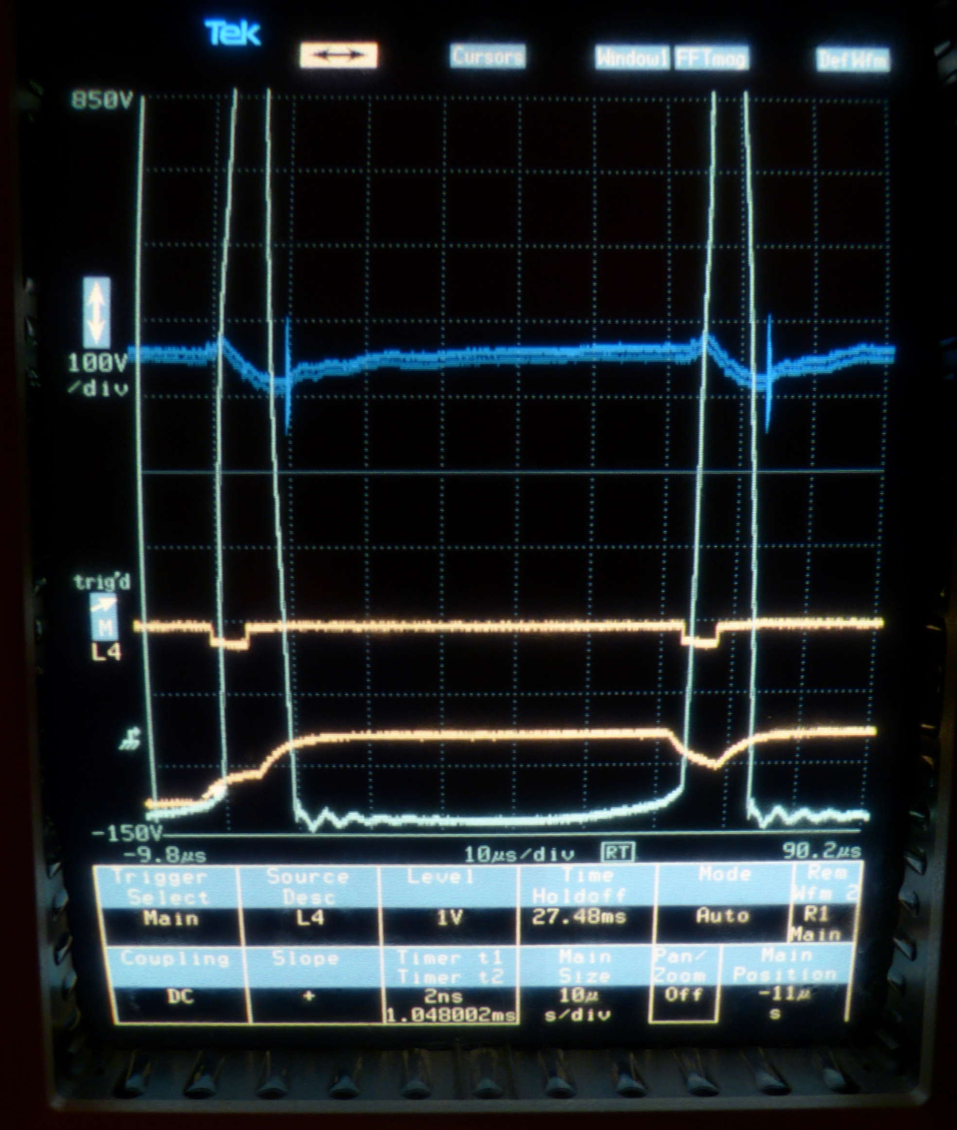 grün: horizontale Ablenkspannung an Zeilentrafo gegen Boosterkondensator (mit 2 Tastköpfen und Differentialeinschub gemessen) blau: Fokusspannung am Fokuspoti (AC mode) gelb: Videosignal gelb: Sync Signal des Videogenerators