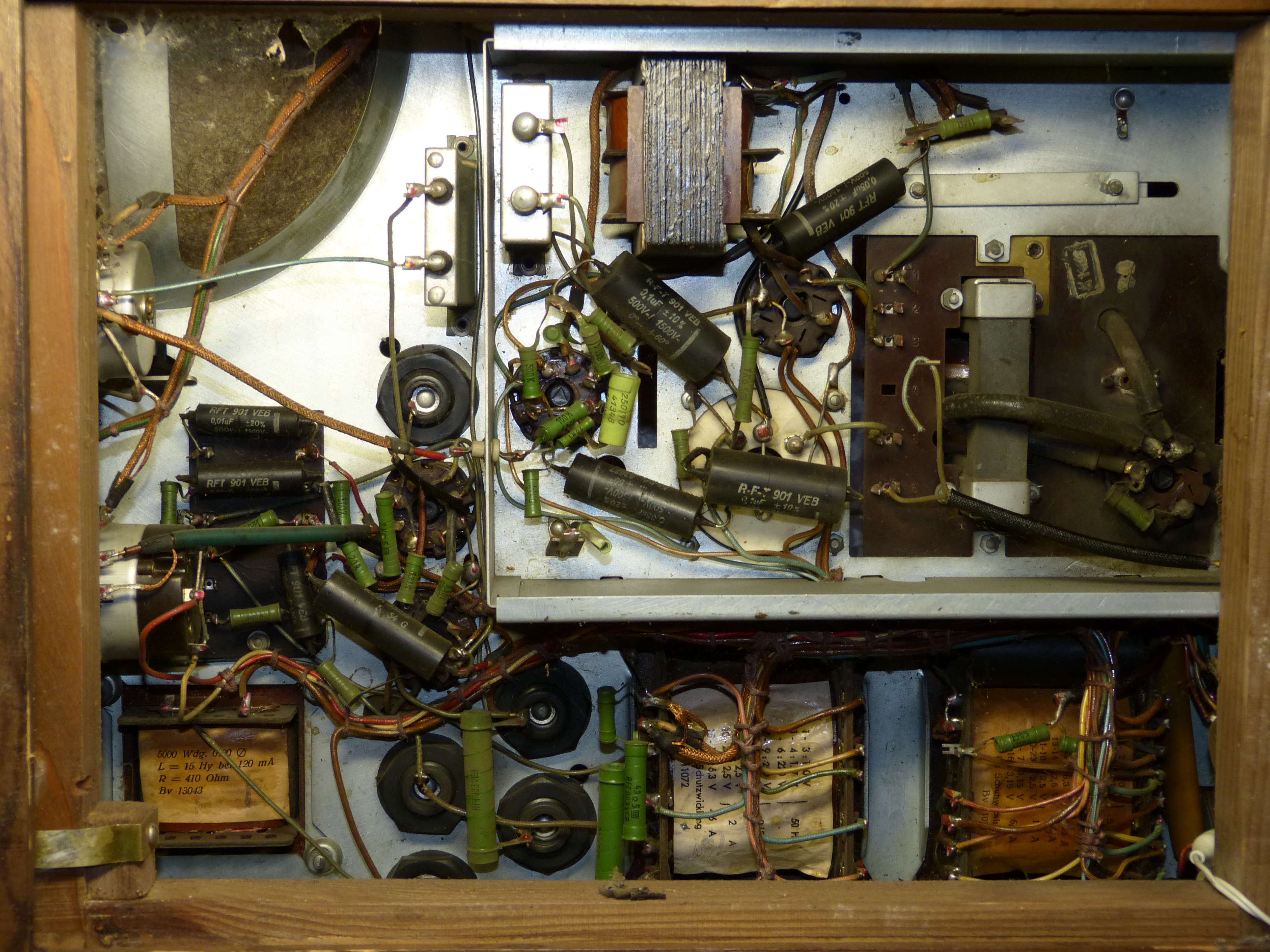 Es handelt sicht um das "D"-Modell. Nach dem Öffnen und grobem Entstauben sah die ganze Elektronik unverbastelt aus, auf den ersten Blick zumindest. Es ist noch der originale Tuner und eine 1Z1 als Hochspanungsdiode. Alle Zettel und Aufkleber sind unbeschädigt und recht gut lesbar.