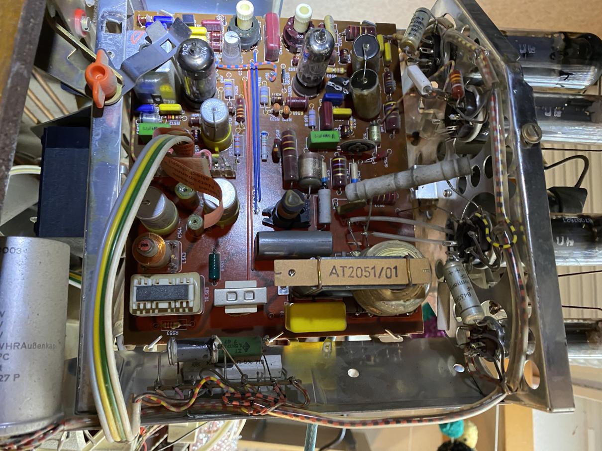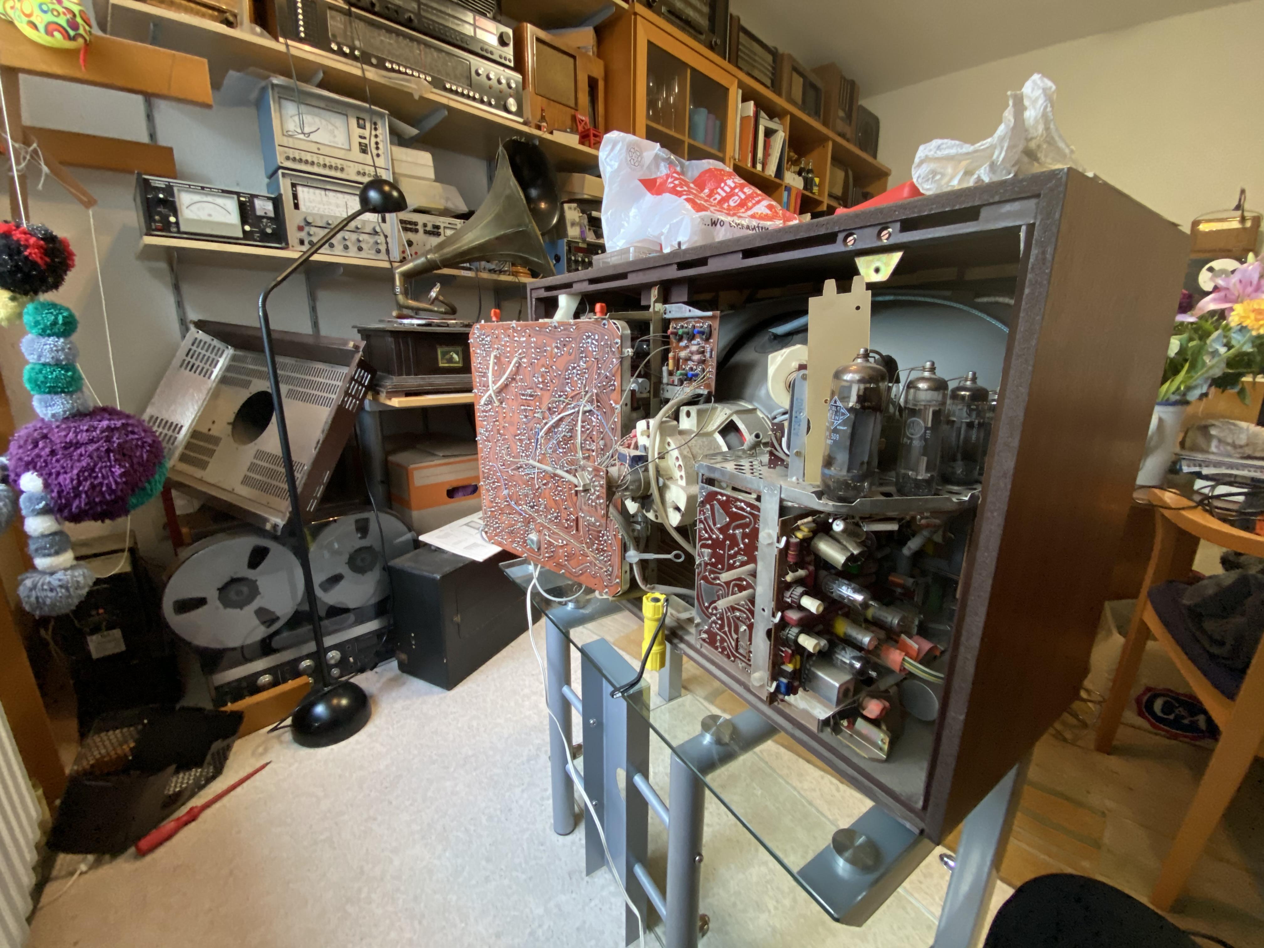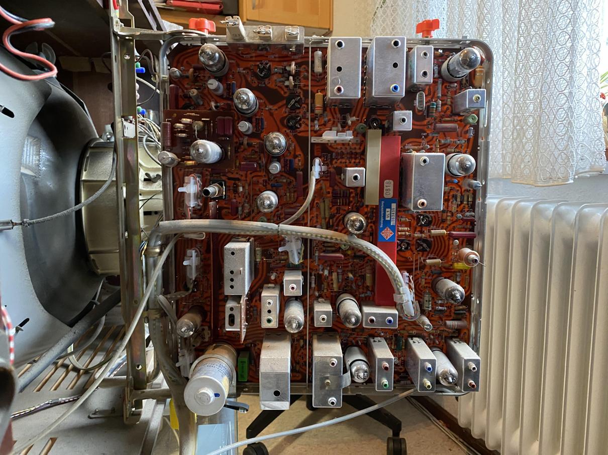 ja sieht noch super aus! Gründlich reinigen und es kann losgehen. Was hat der für eine Farbendstufe? Ich sehe keine 3x PCL200. Hat vielleicht schon transistorisierte Farbendstufen? Dann dürfte der aber nicht mehr 1967 sein, sondern 1-2 Jahre jünger. Nett auch der Röhrenvorrat von Siemens Röhren im Gerät!