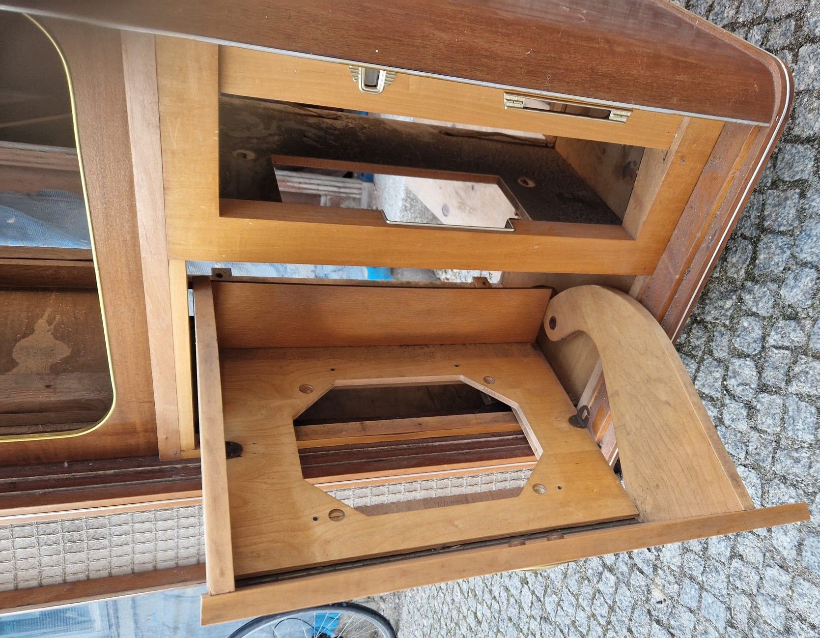 Was könnte in dem leeren Ausschnitt gewesen sein. Ich kenne keinen Fernseher ohne zusätzliche Bedienfront. Welcher Plattenspieler passt auf das ausziehbare Brett?