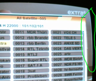 An der linken Bildschirmseite sieht man eine Rotbraune 2 bis 3 mm breite vertikal durchgezogene Linie, die bei normalem Fernsehbetrieb ob helle oder dunkeln Bilder kaum in Erscheinung tritt. Das folgende Foto zeigt bei angeschlossener Multimedia Festplatte über den Front AV Eingang des VHS Video Recorder, deutlich links und rechts beide Linien in diesen Bildschirmanzeigen.