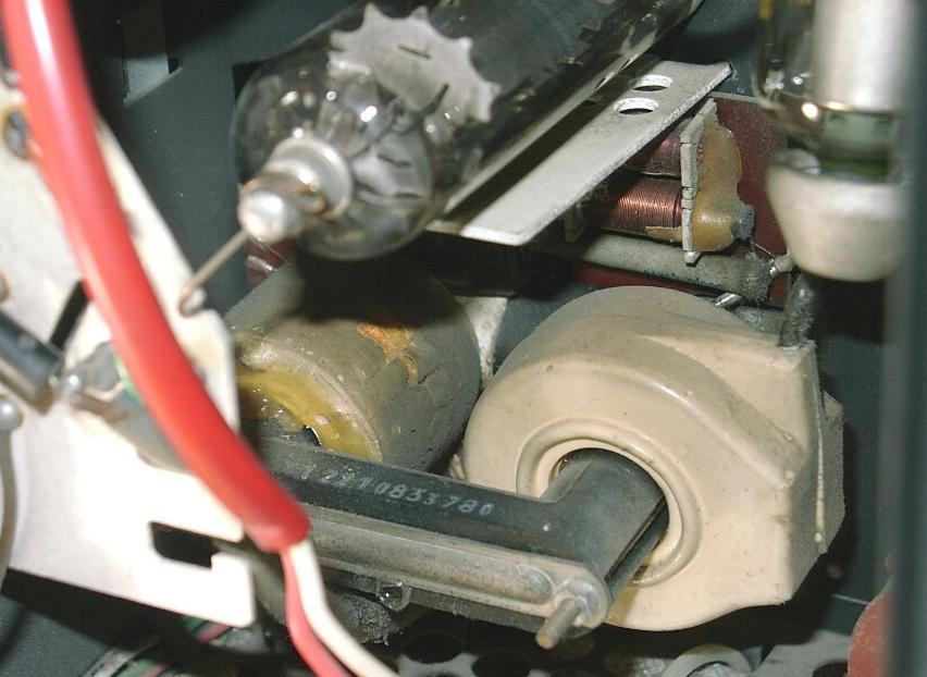 Weiterhin ist mir aufgefallen, dass ein Zeilentrafo die äußere Kunststoffummantelung verliert. (Siehe Bild) Vielleicht ist das auch der Defekt, der vor ca. 10 Jahren plötzlich direkt nach dem Einschalten den Ton sehr laut und im Bild nur Streifen entstehen ließ?