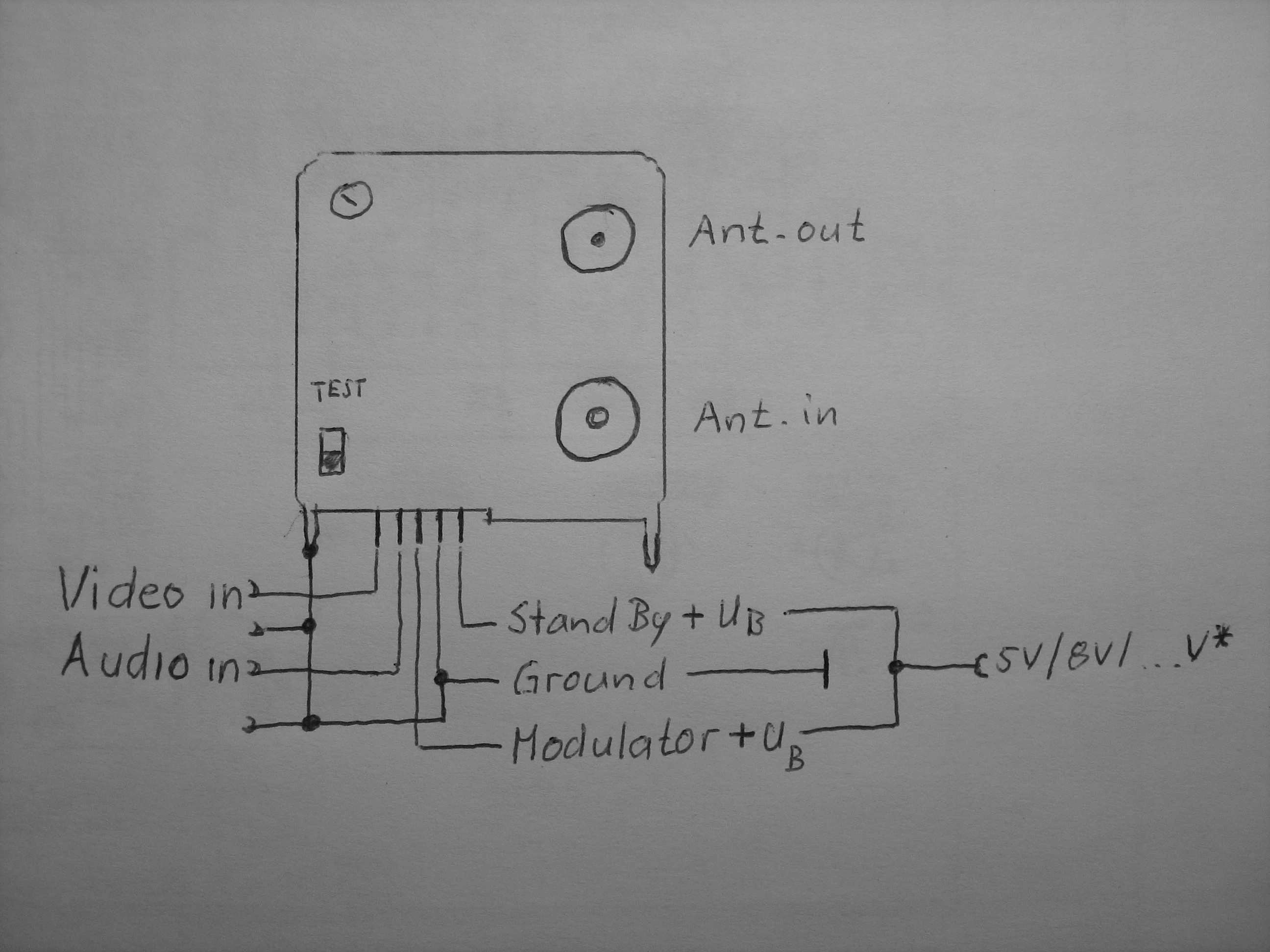 bisher habe ich einmal mit zwei Modulatoren experimentiert. Äusserlich könnten sie Zwillinge sein, aber der eine arbeitet mit fünf*, der andere mit acht Volt. Das müsste man ausprobieren. Die Stromaufnahme liegt um die 50 bis 80mA. Hier das Anschlussschema: