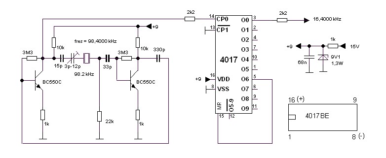 Die 800Hz-NF ergab sich durch den "Quarzersatz", ein 98,2 kHz-Quarz im Glasgehäuse ließ sich mit extrem kleiner Serienkapazität bis auf etwas über 18,4 kHz ziehen, was :6 = 16,4 kHz für den Überlagerer ergibt. Alternative wäre gewesen, einen Vorschlag aus dem WGF aufzugreifen und einen Standard-32,768 kHz-Uhrenquarz zu nehmen und :2 zu Teilen. Es wäre interessant zu wissen, ob sich die entstehenden 16,384 kHz auch hier so weit nach oben ziehen lassen, obwohl das für den Empfang keine Rolle spielt.