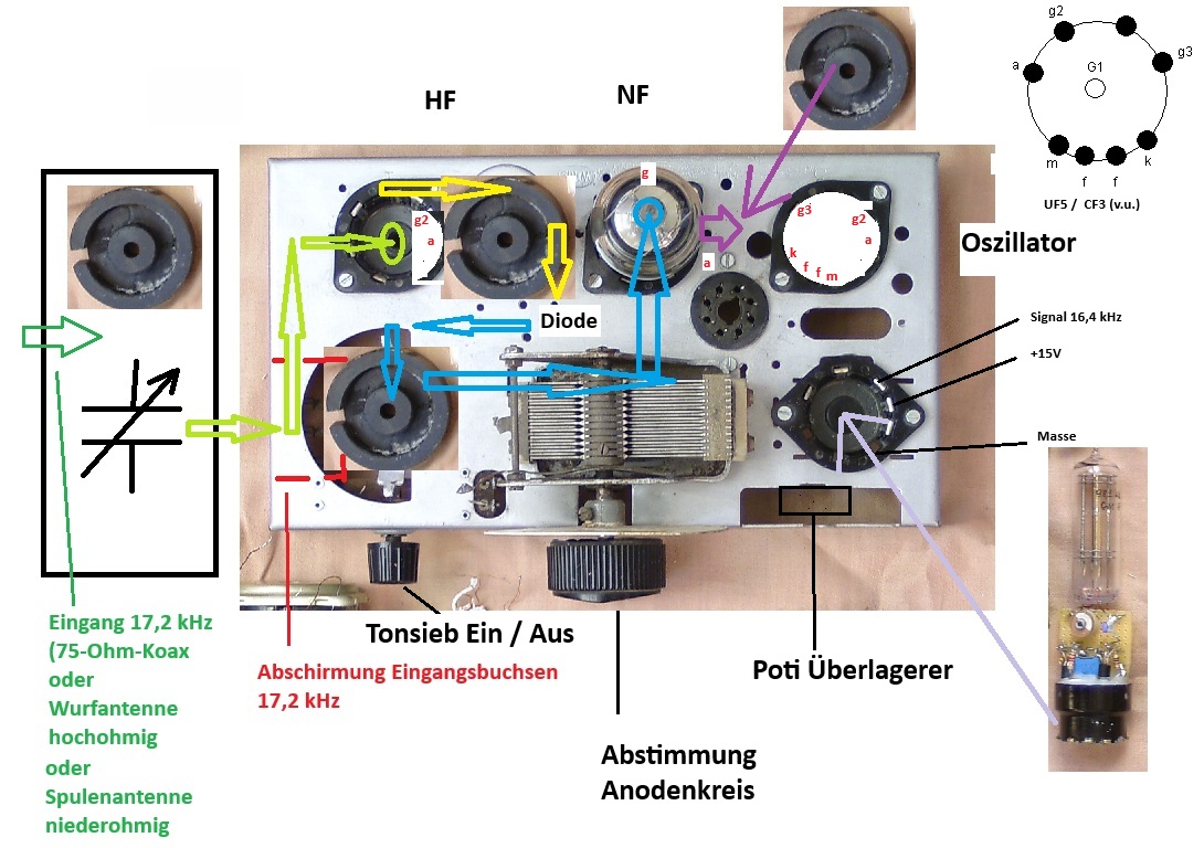 Die Skizze ersetzt den Blockplan: Der externe 16kHz bis 23 kHz-abstimmbare Eingangskreis geht über die VE-Buchsen an die Gitterkappe der Eingangsröhre, deren Anode an den Resonanzkreis, welcher mit dem VE-Drehko ebenfalls abgestimmt ist. Wegen der Grad-Skala des Friktionsantriebes können hier schon mal die 17,2 kHz genau abgestimmt werden. Das HF-Signal wird zusammen mit dem Überlagerungs-Signal auf die Diode gegeben, die treibt einen 800 Hz-Resonanzkreis an ("Tonsieb"), welcher an das Gitter der NF-Kopfhörerverstärker-Röhre angeschlossen ist.