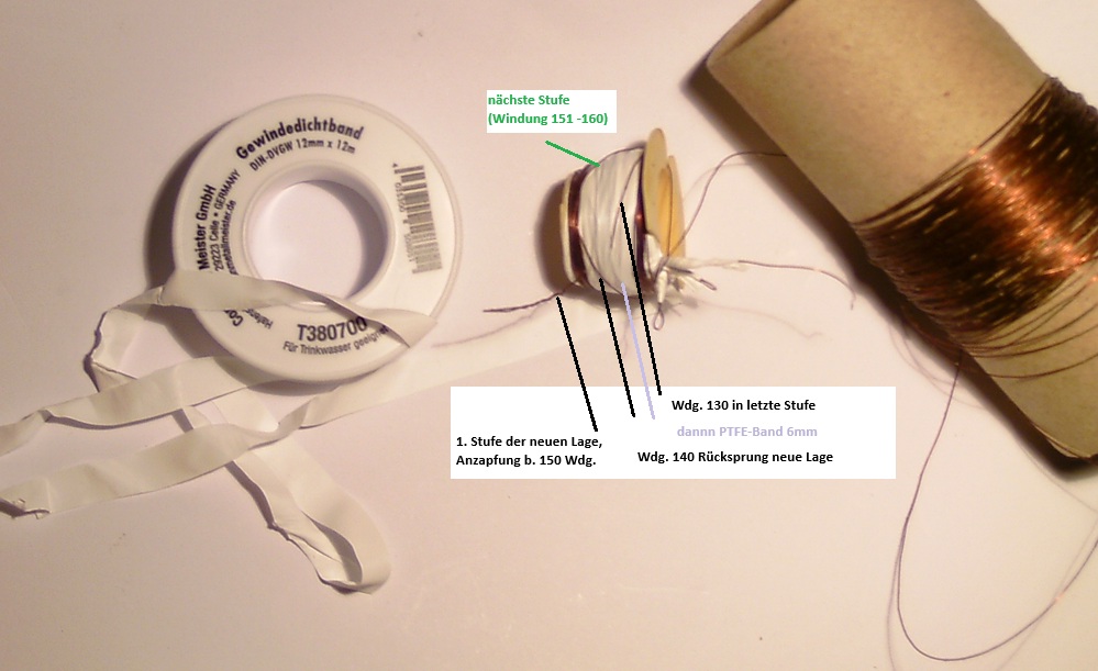 Aus Platzgründen kommt nur Permeabilitäts-abstimung mit dem Abgleich-Kern in Frage. Es soll die Stufenwicklung mal in der Praxis gezeigt werden, da es eine Alternative zur Kreuzwickelspule ist. Das Teflon (PTFE)-Band hat nicht nur geringe dielektrische Verluste, es verhindert auch das Zurückrutschen der nächsten Stufe, wenn es nach Fertigstellen einer Lage direkt im Anschluss über diese gewickelt wird.