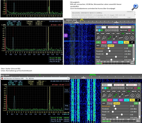 Für andere Sachen, sei es nun E108Lw4/7 ,selektive Pegelmessgeräte, Dpektrumanalysatoren, der ESIB oder auch nur das Kiwi, hab ich keine kalibrierten Antennen für den VLF Bereich. Zudem ist sowas auch eine Standortfrage, ich steh hier nicht im Beam sondern eher im Abseits, d.h. SAQ kommt nur schwach hier an.
