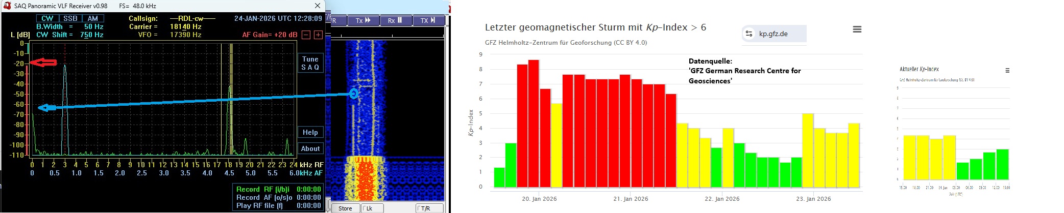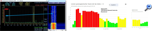 Damit wurde während des letzten Sonnensturmes RDL beobachtet, das Grundrauschen ("noise floor") stieg mit 10dB deutlich an. Jetzt ist sprichwörtlich alles im grünen Bereich und RDL macht tagsüber wieder 40dB SNR und es ist sehr ruhig geworden.