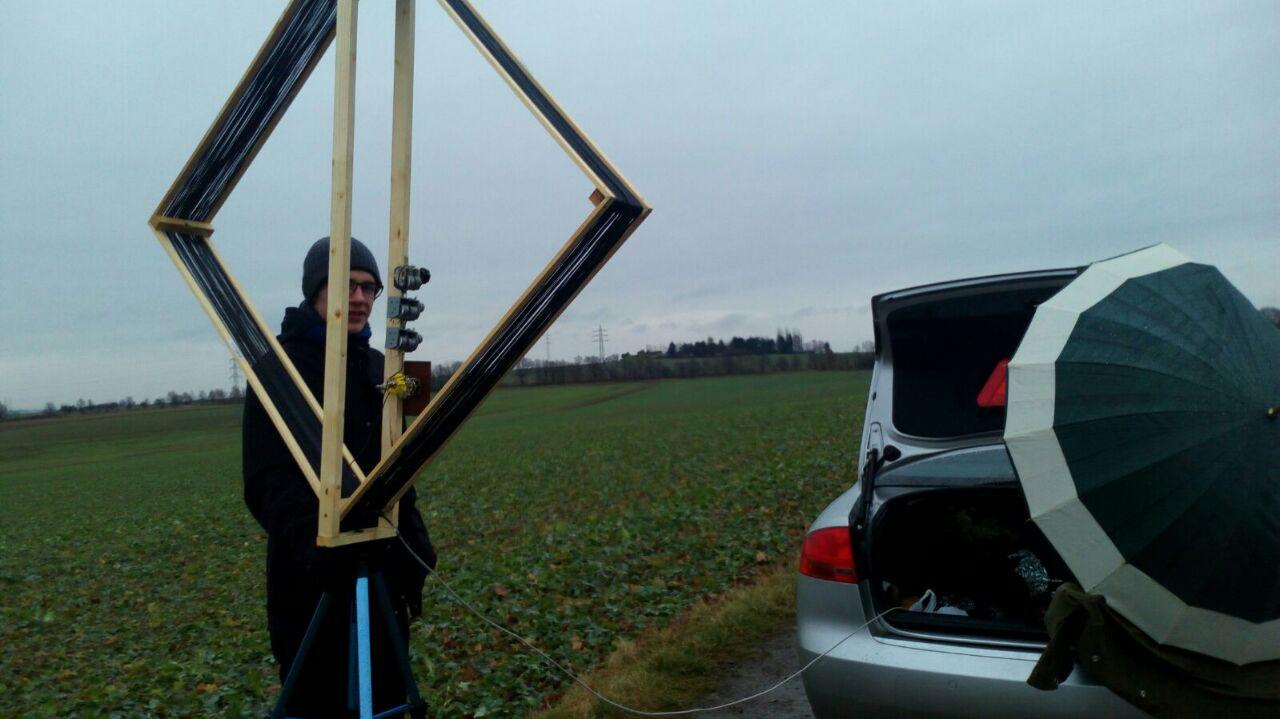 -8:15, warten, Kaffee trinken. Das Wetter wurde zunehmend schlechter. Die Drehkos habe ich dann kurzerhand in Alufolie eingewickelt, für meinen Kumpel hat es nicht gereicht, der musste weiter im Regen stehen. Die Empfangstechnik lag im Kofferraum, den ich dann mit einer Plane zugedeckt hatte.