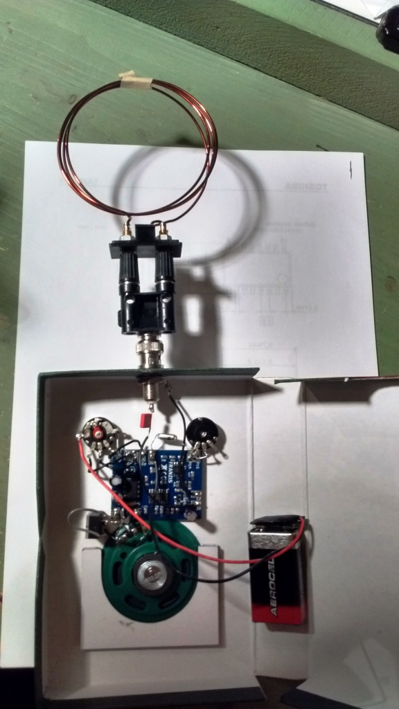 Anstatt des Ultraschallwandlers habe ich eine BNC Buchse über eine Kapazität an den Eingang des Detektors angeschlossen. Eine zusätzliche Kapazität am NE555 lässt den Oszillator zwischen 12 und 60kHz Schwingen. Ein zusätzlicher Kopfhöreranschluss sorgt für Ruhe beim Empfangen.... Mit der MiniWhip als Antenne und meinem resonanten Ferrittstabschwingkreis bringt er beachtliche Empfangsergebnisse auf VFL...