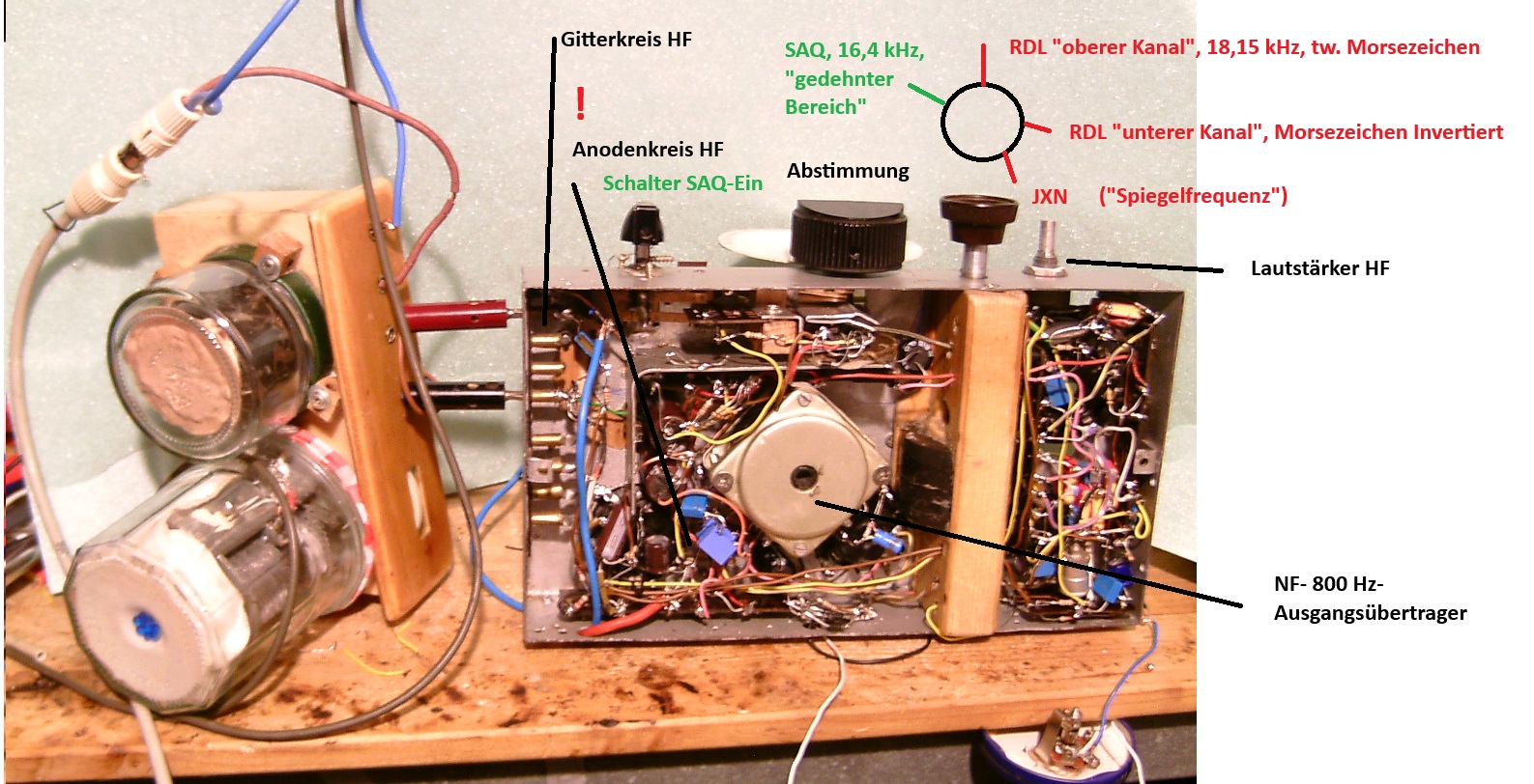 Höreindruck: Wird RDL eingestellt und auf SAQ umgeschaltet, ist RDL weg, wegen des Tonsiebes. RDL ist ein scharfes Kriterium für einen SAQ-Empfänger, weil man zwei Kanäle hat, die nur 80 Hz auseinanderliegen. Bei Behelfsantenne am niederohmigen Eingang des externen Vorkreises ist auch dieser scharf, Beide Kanäle von RDL lassen sich trennen, es ist dann jeweils nur ein leiser Dauerton zu hören.