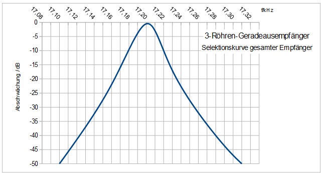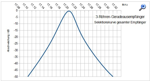 Ein Draht wurde mit 2 Windungen um das Glasgehäuse des externen Eingangskreises gewickelt und koppelt so lose kapazitiv auf den Ferrit-Schalenkern. Beim angeschlossenen HM8032 wurden alle Abschwächer gedrückt, der Empfänger so eingestellt, dass die erzeugten 6mVpp 40 mVpp NF erzeugen. Dann wurden in 10dB-Abständen die Abschwächer herausgenommen und die beiden Frequenzen aufgeschrieben, bei welchen dann ebenfalls die 40mVpp erzeugt werden. Bei 1800mV (50dB) endete die Messung. Es ergibt sich so die Selektionskurve des gesamten Empfängers: