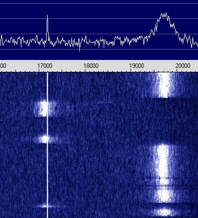 Hallo Ingo und alle, diesmal wll ich doch wenigstens versuchen, ob ich irgend etwas empfangen kann. Dazu soll eine einstellbare 14 mH Schalenkernspule und passender Kondensator genutzt werden. Habe die Audiokarte mit Spectran angeworfen und beobachte jetzt unregelmäßig wechselnde Baken bei 17,1 und 19,75 kHz (die schmale Linie stammt von einem HP Testoszillator 651B, etwa 50 µV ). Was kann das sein? Nächtliche Grüße, Jan