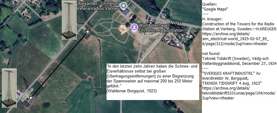 Ein anderes Puzzleteil erklärt aber schon mal, warum die Masten eigens in Schweden konstruiert wurden. (Winterstürme, Schnee-Eislast) https://archive.org/details/teknisktidsk...up?view=theater "SVERIGES KRAFTINDUSTRI." Av överdirektör W. Borgquist, TEKNISK TIDSKRIFT 4 aug. 1923" Demnach wurde in Grimeton die übliche Mastentfernung von 200-250m erheblich überschritten, vielleicht wegen der geringeren HF-Verluste durch die geerdeten Masten.