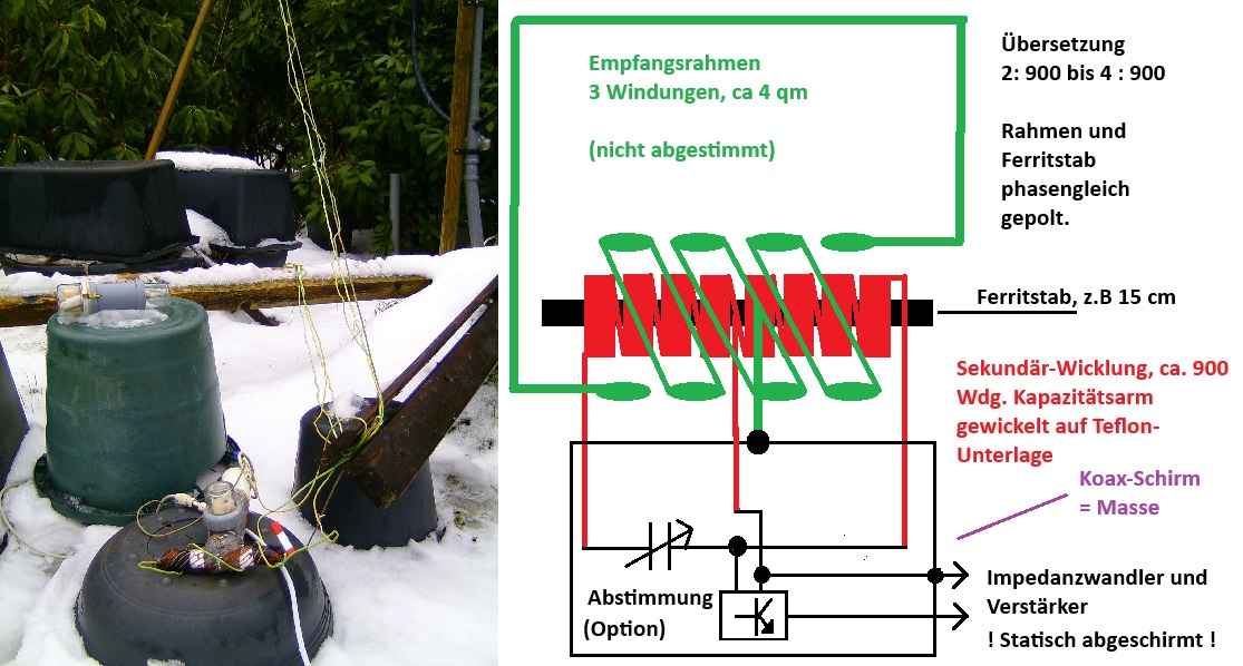 Der Anschluß eines Drahtes in etwa 3m Höhe ("Wurfantenne") zeigte, dass es nicht möglich ist bei der hohen Übersetzung 1:900 das E-Feld aufzufangen. Erst bei zweiseitigem Anschluss als Empfangsschleife wird ein verwertbarer Strom durch das H-Feld induziert. (Magnetische Komponente) Hier würden sich durch ein E-Feld erzeugte Ströme gegenseitig weitgehend neutralisieren.