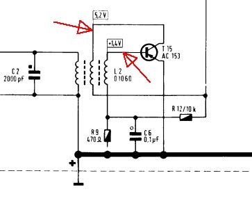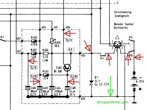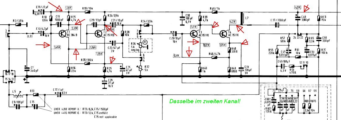 Eine "Achillesferse" bei diesem Gerät ist die niedrige Betriebspannung von 6V bei Akku/Batt.-Betrieb, die den Konstrukteuren wenig Spielraum gelassen hat für eine Stabilisierung von Arbeitspunkten in der Schaltung. Schon eine relativ geringe Verschiebung eines Arbeitspunktes in einem der Verstärkerblöcke etwa durch Widerstandsalterung oder Elkoleckstrom kann zur Blockierung führen.