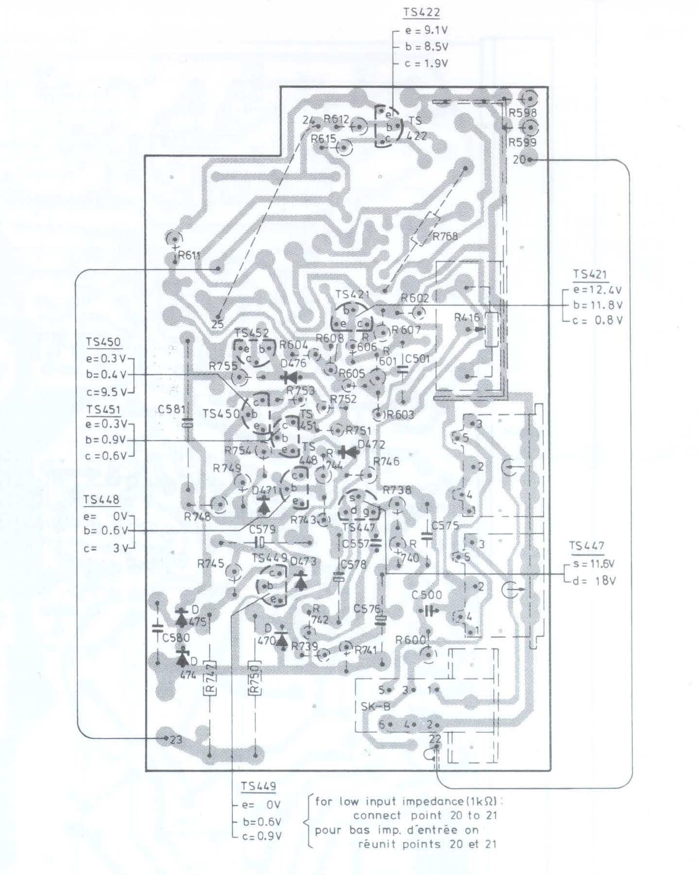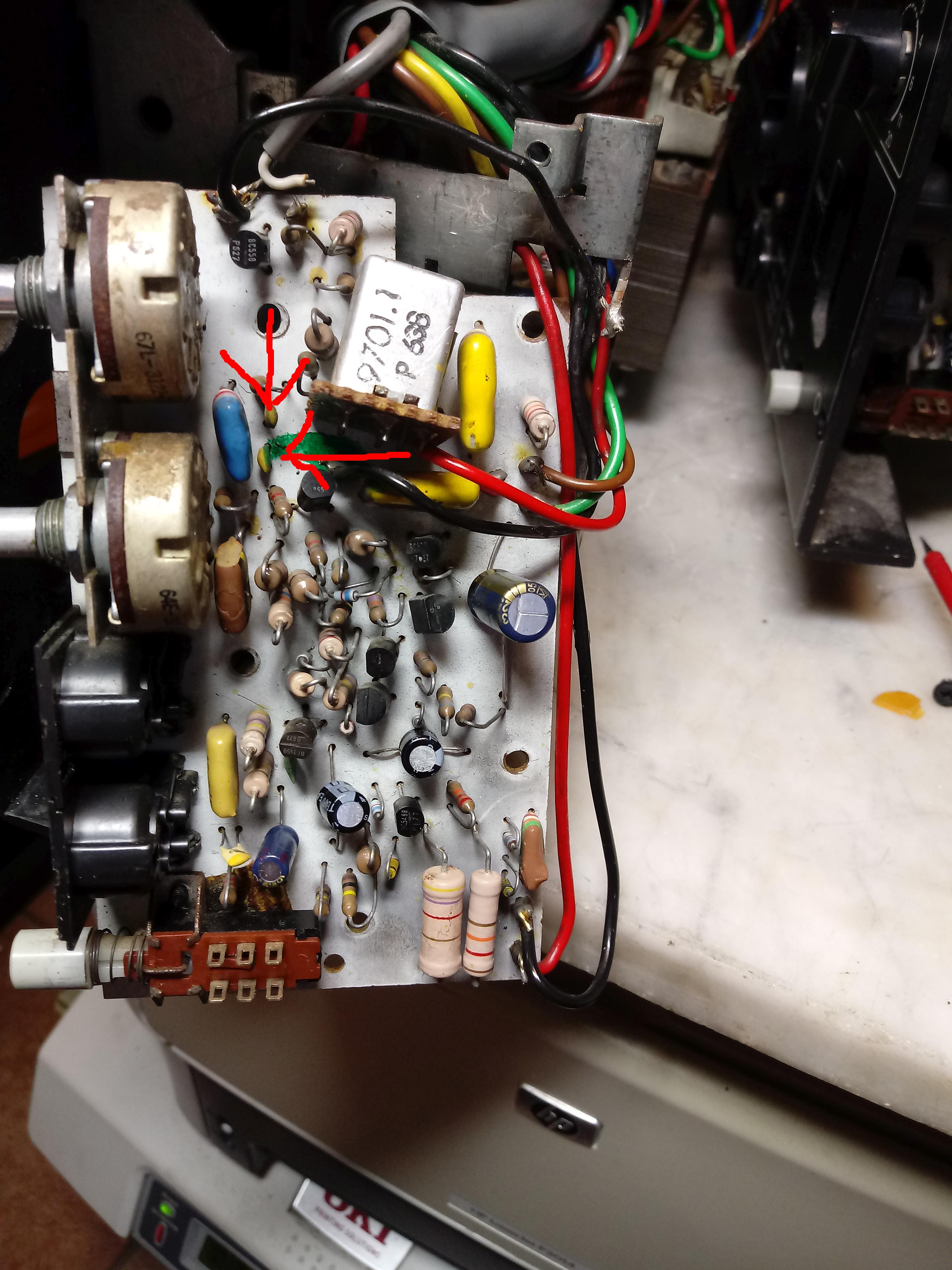 Nun bin ich am Eingang der Lautsprecher. Da stimmen schon ein paar Spannungen an den Transistoren nicht. Weiter hab ich durch Zufall gesehen das ein Kondensator gebrochen ist. Hab das auf dem Bild eingekreist. Diese kleine Platine macht mir etwas Probleme. Sie ist nirgentwo Beschriftet. Ich muß also jedes Bauteil Aufschreiben und dann in den weiteren Plänen suchen und schauen was es für Werte hat. Zudem und für mich Übel scheint meine Platine anders zu sein wie das was im Plan ist. Da sind Bauteile die ich so nicht finde. Ich hab mal Rote Pfeile in die Bilder gemacht. Und dann sind da ja diese bunten Kondensatoren. Da steh ich denn was die Werte betrifft auf dem Schlauch. Bei Wiederständen kann man die Farben so schön eingeben und bekommt angezeigt was es ist, aber für die Kondensatoren hab ich noch nichts finden können. Ich hab sie jetzt mühsam aus den Plänen rausgesucht und denke das es richtig ist.