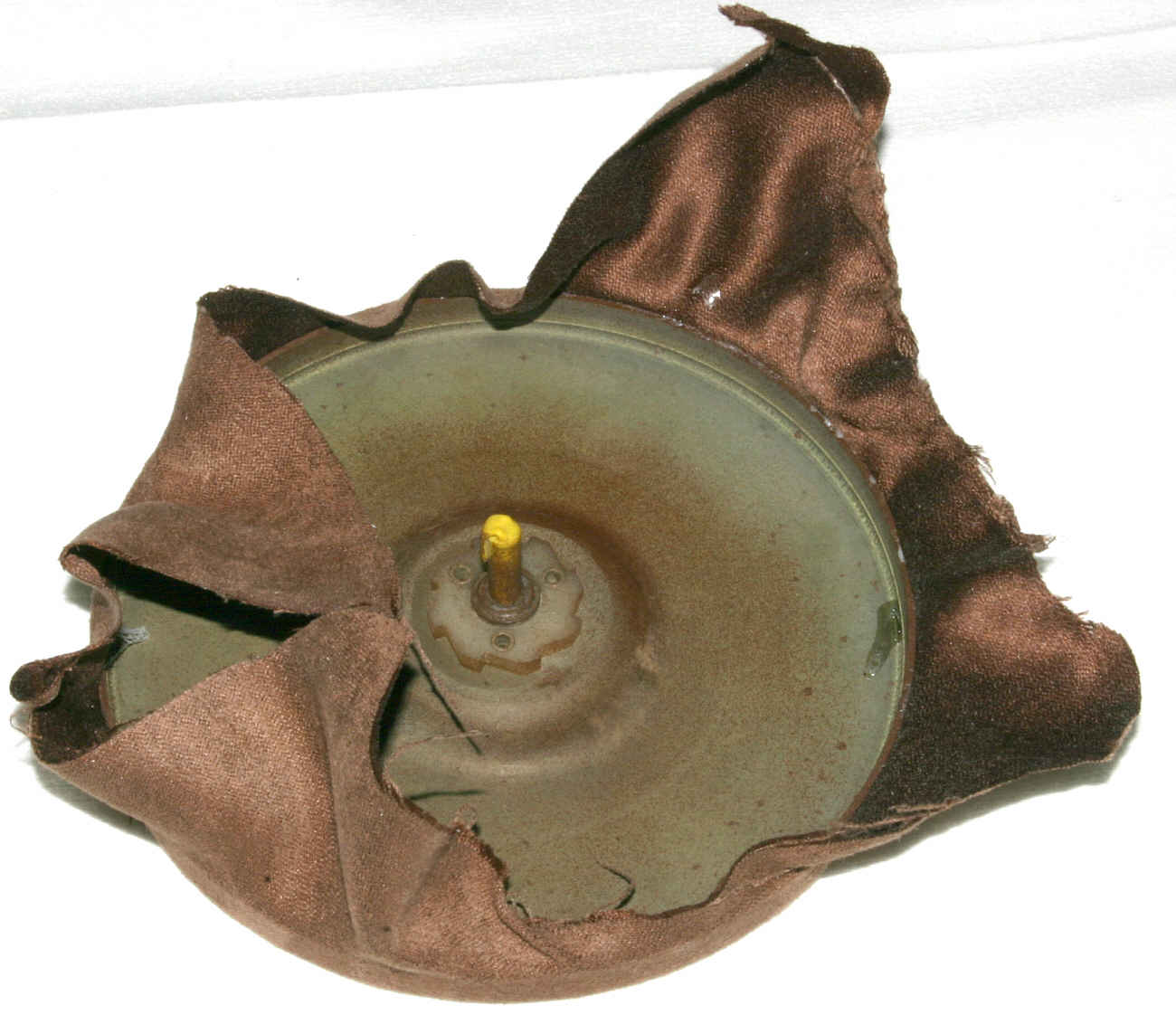 Nun muss ein neuer Bezug drauf. Es gibt Firmen die eine Neubeflockung durchführen. Das kostet ca. 30 Euro. Ist mir etwas zu teuer und ein textiler Bezug tut es auch. Einen passenden Stoff zu finden ist nicht ganz einfach. Er sollte von der Struktur her passen, die richtige Farbe haben, darf nicht zu dick sein (sonst sitzt der Puk später zu hoch) und sollte eine gewisse Elastizität haben, da er ja um die Rundungen des Tellers faltenfrei herumgezogen werden muss. Ich bin bei einem Deko-Kissen fündig geworden, das für diese Zwecke geschlachtet wurde. Zum Verkleben hab ich Kontaktklener aus der Sprühdose verwendet. Abraten muss man vom Pattex Sprühkleber. Dessen Sprühkopf ist eine unmögliche Fehlkonstruktion. Viel besser ist der Sprühkopf von "Uhu permanent".