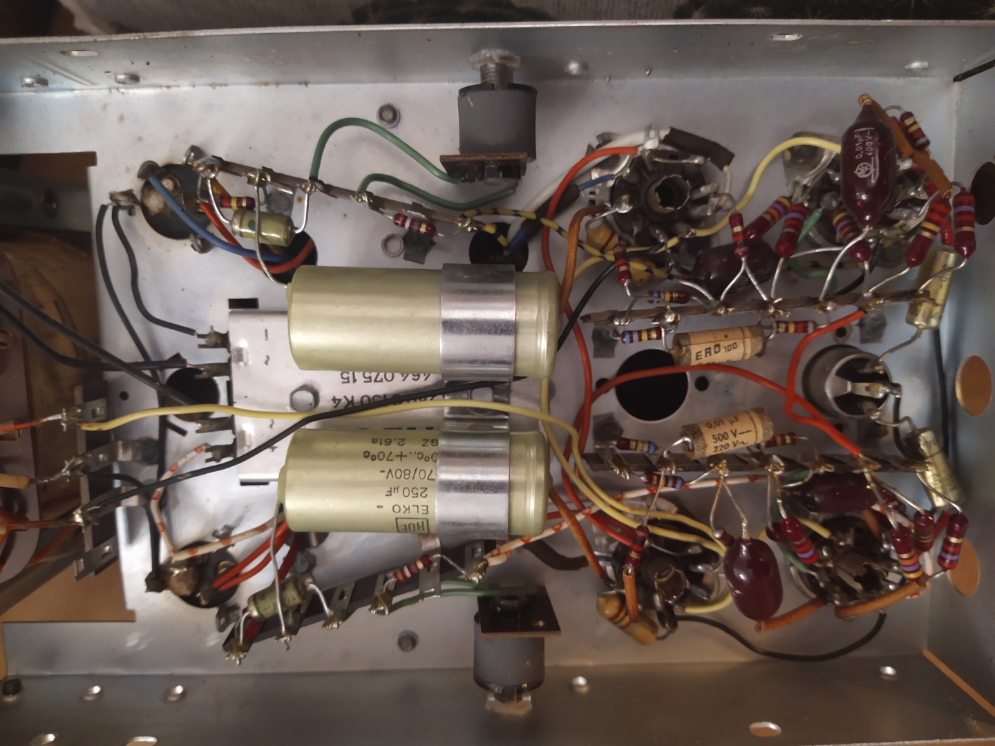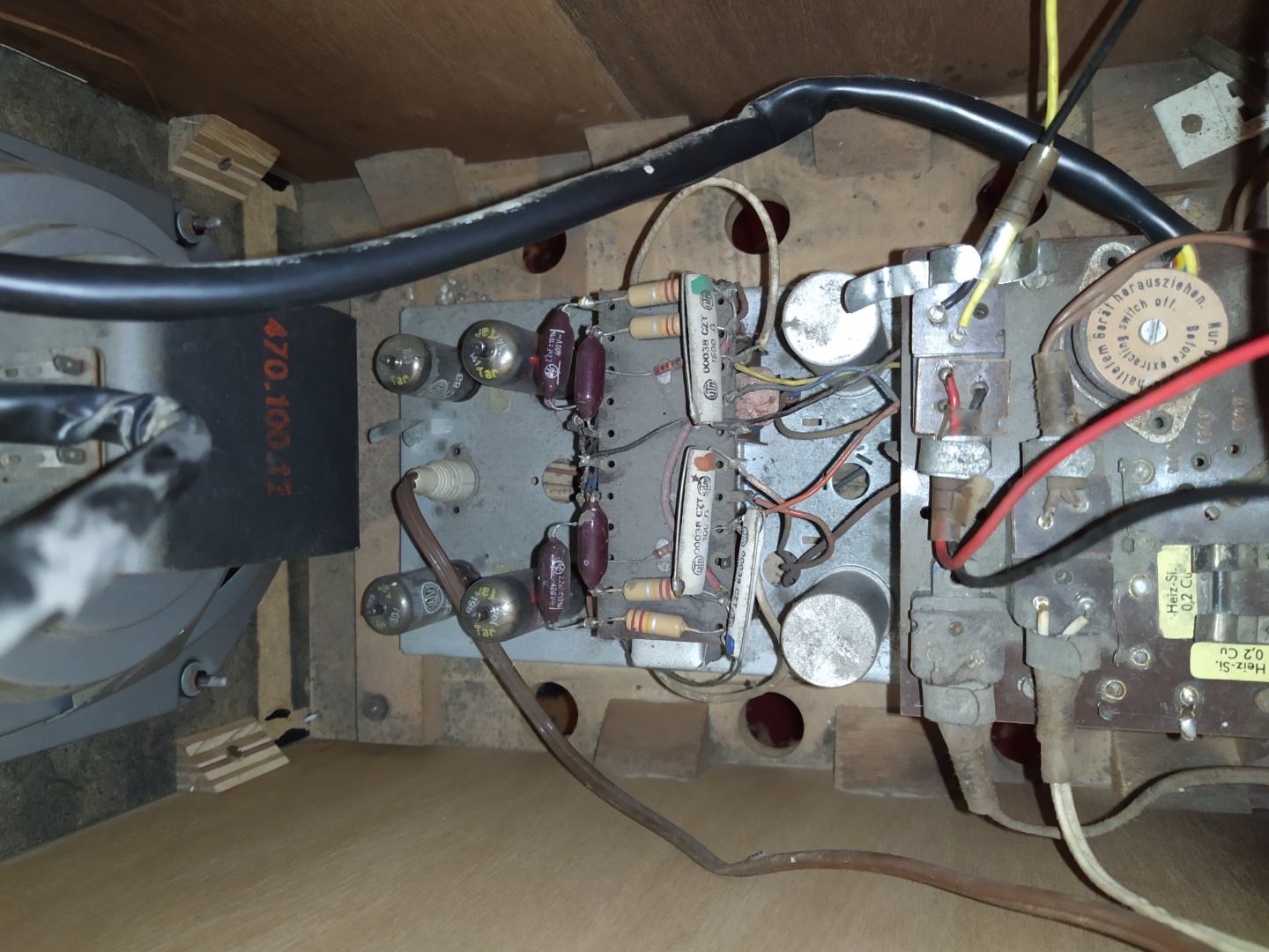 Habe auch schon ein Paar Neuteile besorgt. Röhren und Kondesatoren FKP1-630 2,2N Impulskondensator, 2,2nF, 630V, 400V~ RM15 (als Ersatz für die Wimas, 2,2nF 400V~) 2x ECC83 und 4x EL95 mit 2 x Adapter, Ersatz ELL80) ..und 2 Dosen Teslanol T6