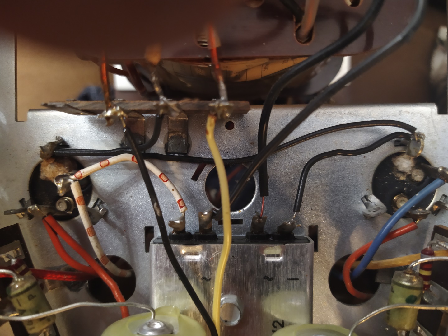 Falls die Anodenspannung (nach der Kondensatorkur) zu niedrig ist, dürfte der Gleichrichter hinüber sein (dann wird er meistens auch ziemlich warm oder sogar heiss), die Selen-Dinger altern zum Teil auch (muss aber nicht sein, wenn die Spannung stimmt, würde ich ihn (vorerst) drinlassen). Falls Ersatz notwendig ist, kann man einen Si-Gleichrichter oder 4 Einzeldioden (z.B. 1N4007) und einen 47/5W-Seriewiderstand im Plus-Pfad verwenden (siehe auch Kompendium). Falls es nach faulen Eiern riecht, muss der Gleichrichter auf jeden Fall ersetzt werden.