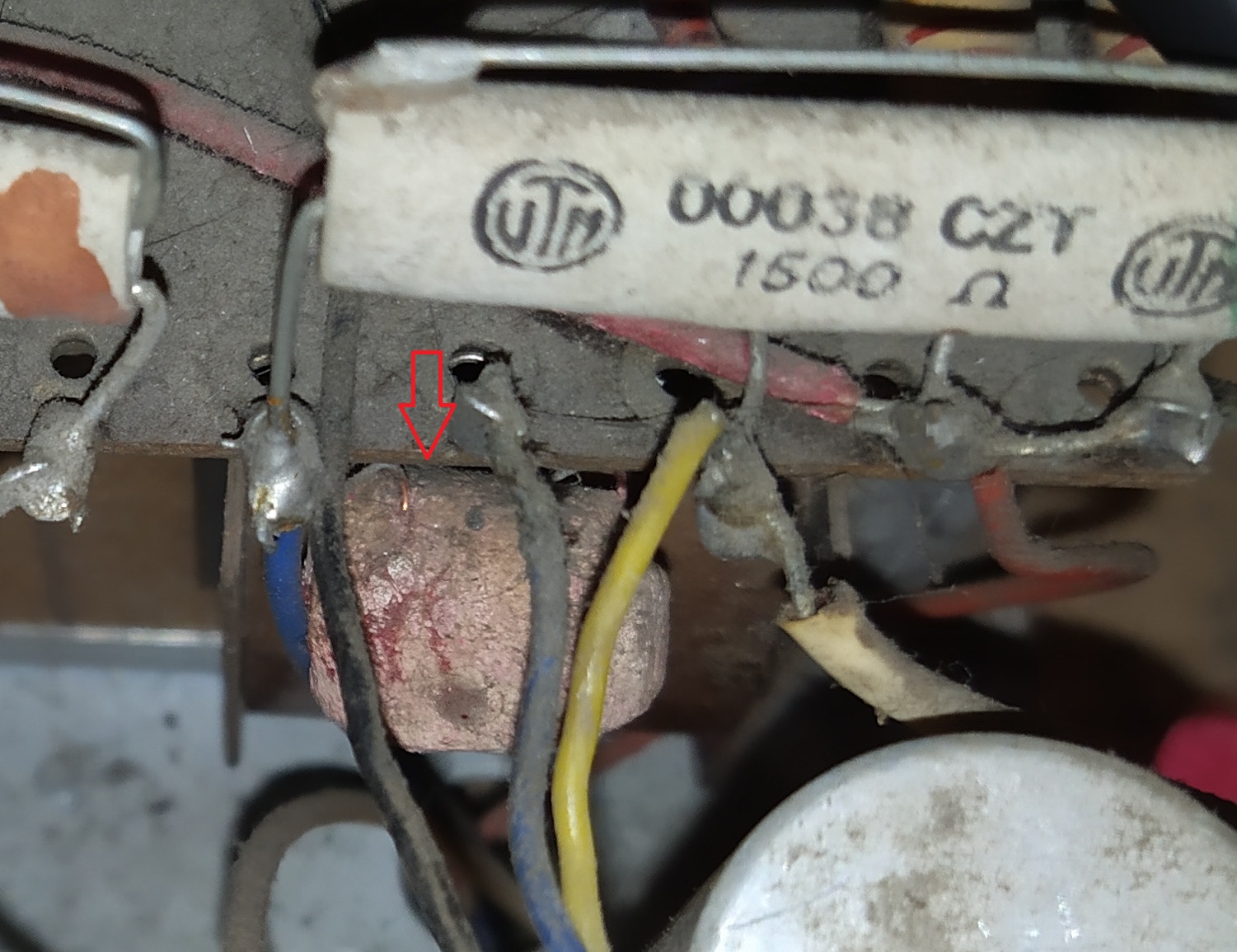Ist ein hocbelastbarer (ein paar Watt) 1,5k Drahtwiderstand im Keramik/Zement-Gehäuse. Muss irgendwo im Schaltplan auftauchen. Aber die sind meist nicht defekt.