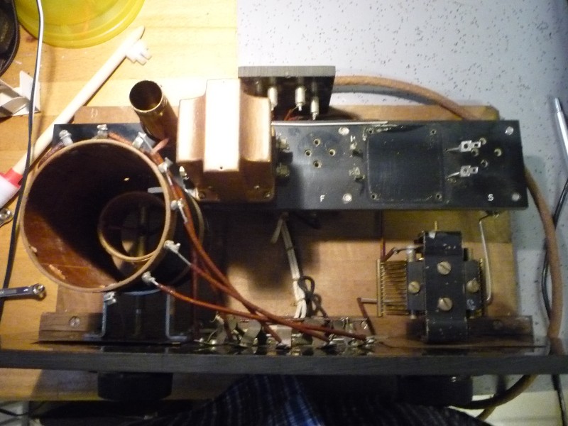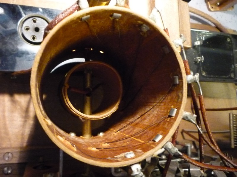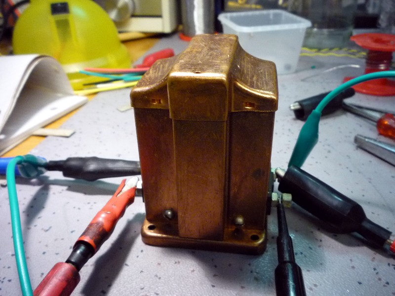 Hallo zusammen, der Fortschritt ist eine Schnecke.. aber es ist gelungen, zumindest den ersten der beiden Übertrager zu reparieren. Er war allerdings nicht einfach und basiert auf der Annahme, dass das Übersetzungsverhältnis 1:5 beträgt. Die ursprüngliche Sekundärwicklung war nicht mehr abzuwickeln und musste weggeschnitten werden. damit war Drahtlängen- und oder Wicklungsangaben verloren. Die Primärwicklung war zum Glück noch erhalten, so dass von deren Widerstandsangaben auf die Sekundärseite geschlossen werden konnte. Voraussetzung: gleicher Drahtquerschnitt mit (hoffentlich) gleichem Speziv. Widerstandswert. Das nächste Problem war ein Drahtlieferant zu finden, welcher Klein- (aber auch nicht zu kleine) Mengen abgibt. Der Kompromis fand sich schliesslich inder Abgabe von 25 g Gebinden. Das bedeutet 2 Flickstellen, da theortisch ca 63 g benötigt werden. Ergebnis der Wickelei: Primär 2,65 , Sekundär 14,1 kOhm Erschwerend kam hinzu, dass der Wickelkörper rund und das Blechpaket jedoch viereckig mit einem für mich unbekannten Schnitt ist. Ein Blechteil ist ein U und das korrespondierende ein T, welche wechselseitig in den Spulenkörper eingeschoben werden müssen. Zusammengehalten wird das Blechpaket durch das Kupfergehäuse. Durch diese Konstruktion neigt der Spulenkörper zum reissen, was auch leider geschehen ist. Trotzdem es geht wieder.