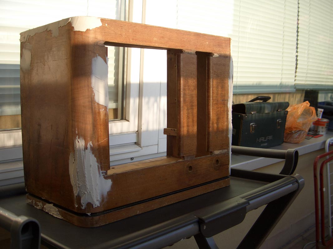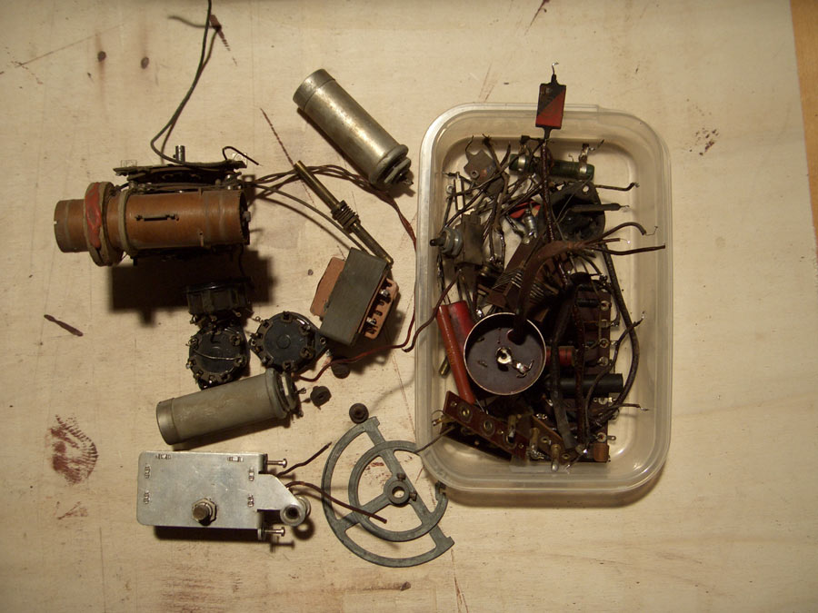 Im Juli habe ich, bei *(W)*, ein Radio Marke VEFAR-2MD36 (Riga, Lettland, Bj. 1936) gekauft, in sehr schlechtem Zustand. Jemand hat der Netzteil demontiert und hat versucht das als Allstrom-Radio umzubauen. Gehäuse war auch schlecht, Lack abgegangen. Alle Röhren fehlten u.s.w. Dann habe ich angefangen... So hat das alles ausgesehen: