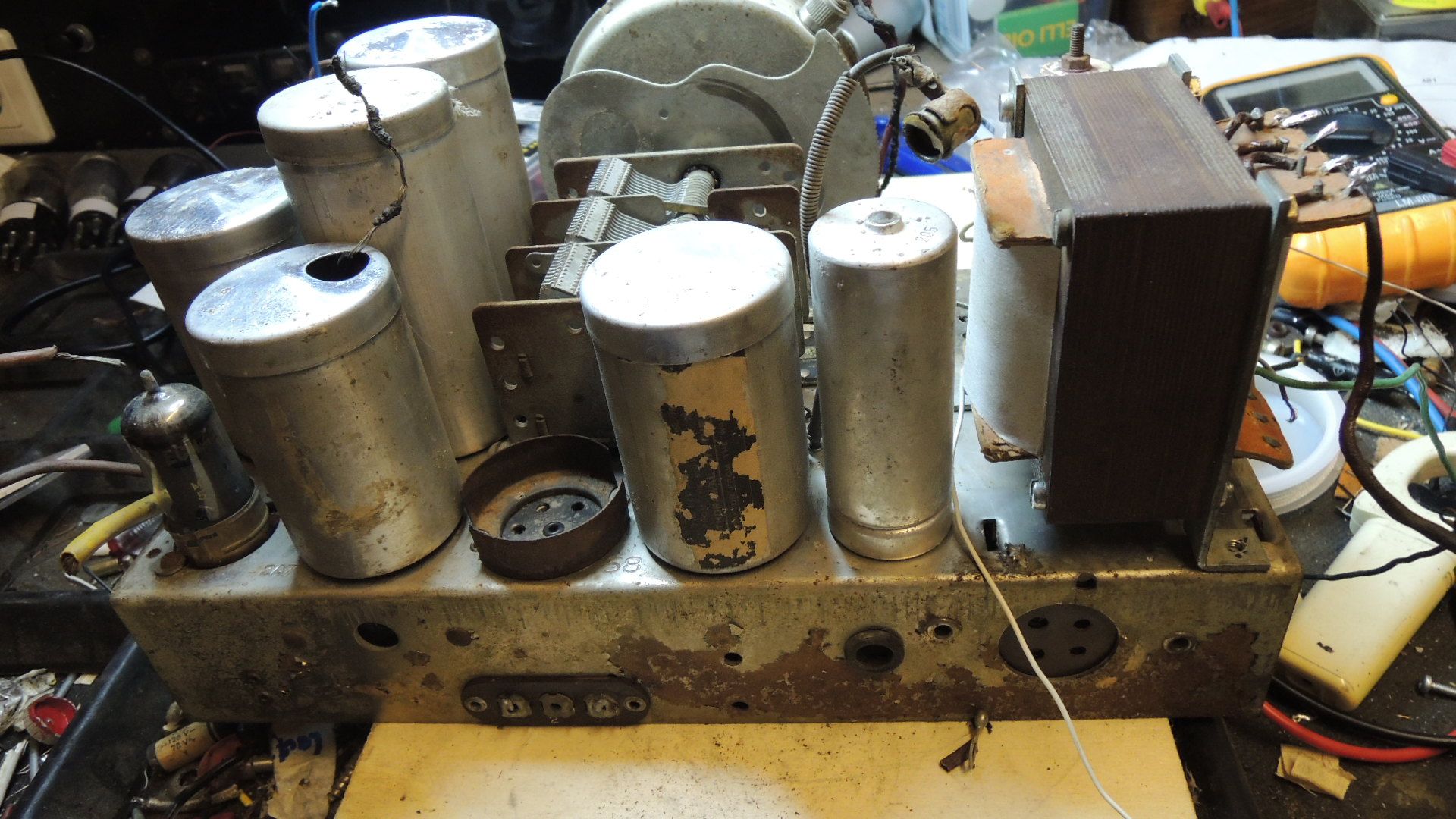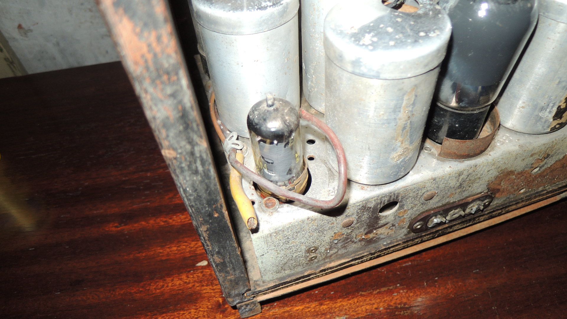 mal wieder zum Atwater 145. Gestern nun habe ich mal damit angefangen, die sicherlich schlechten Kondensatoren zu tauschen. Die teilweise porösen Kabel hatte ich erstmal provisorisch isoliert, damit es hier nicht funkt. Die Skalenbleuchtung wurde erstmal abgelötet. Wie gesagt, alles was "Ballast" ist wird erstmal fern gehalten. Nun habe ich dann den Trafo angeschlossen. Sekundär nutzt er momentan eine Halbwelle des Anodenwickels. Dann geht es auf den Anschluß der Lautsprecherbuchse. Ebenso wurden die Heizungsanschlüsse für die 2,5 Volt Röhren angeschlossen. Nochmals genaue Sichtkontrolle. Jetzt habe ich vorsichtig Spannung auf den Trafo gelegt und hochgeregelt. Plötzlich begann Leben in das Gerät zu kommen. Der Netzton war hörbar. Tippt man auf das Steuergitter der Triode-Anode gibt es ein lautes Kreischen. Womit ich nicht gerechnet hätte: Wenn man mit dem Finger auf die davor befindliche 1 SZ-Röhre tippt, wackelt bei niedriger Lautstärke das Lautsprechertuch vom Prüflautsprecher. Es sieht also ganz hoffnungsvoll mit dem Radio aus. Brummeinstreuungen des Netztrafos gibt es keine, auch die entsprechenden Spannungen sind richtig. Wie geht es weiter? Heute werde ich die im Moment noch freie 5 Volt-Gleichrichterheizung auf die ECH42 geben. Mal sehen, ob der Oszillator sich noch rührt. Die ECH 42 war übrigens in der Tat mit über die 2,5 Volt Heizung der anderen Röhren geheizt worden. Wenn der Oszillator nicht funktionieren sollte versuche ich zunächst eine andere ECH42. Vielleicht ist die andere schon längst an Unterheizung defekt geworden. Ich schrieb ja bereits, sollte sich die Eingangsstufe mit Oszillator auch als reparabel erweisen, werde ich sofort die passende Mischröhre und die Gleichrichterröhre 80 beschaffen.