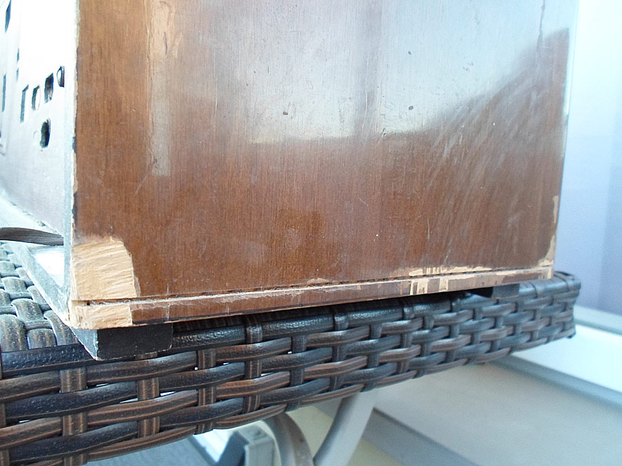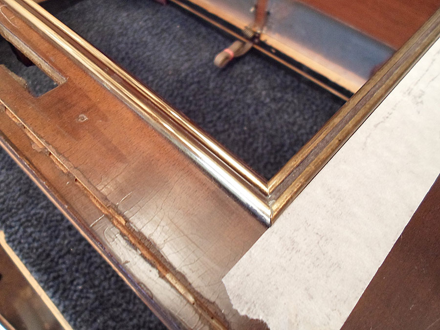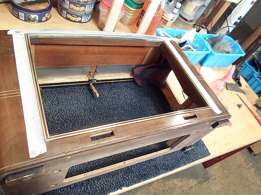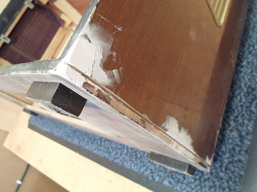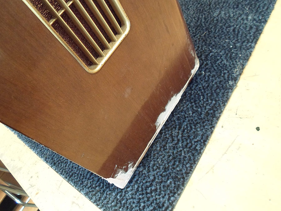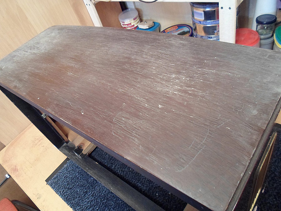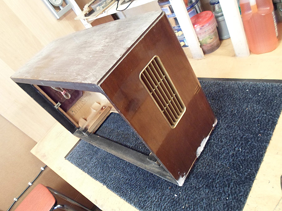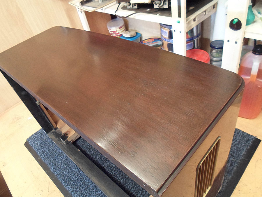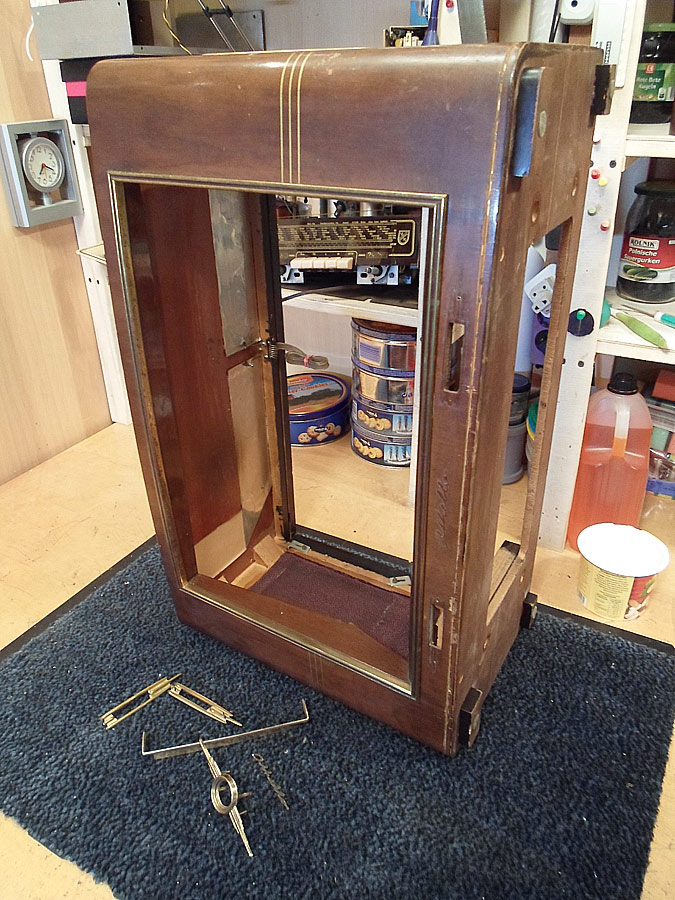 Ich probiere das Lackschicht vom Gehäuse zu reparieren. Da für gibt mehrere Wege. Z.B. mit so genannten Französische Politur. Gute Ergebnis bringt auch Arbeit mit dem Lackreinigung, aber hier geht es nicht. Das Gehäuse ist zu stark beschädigt. Mann muss erst mal die Furnier reparieren, was schon nicht einfach ist, und dann abgeblätterte Lackstelle möglich gut vertonen, das die nicht, oder fast nicht zu sehen werden. Ist auch nicht leichte Aufgabe. Dazu kommt noch Probleme mit fehlende Leiste. Die soll ich auch irgend wie selbst basteln. Also, irgend wie versuche ich das alles hinzukriegen.