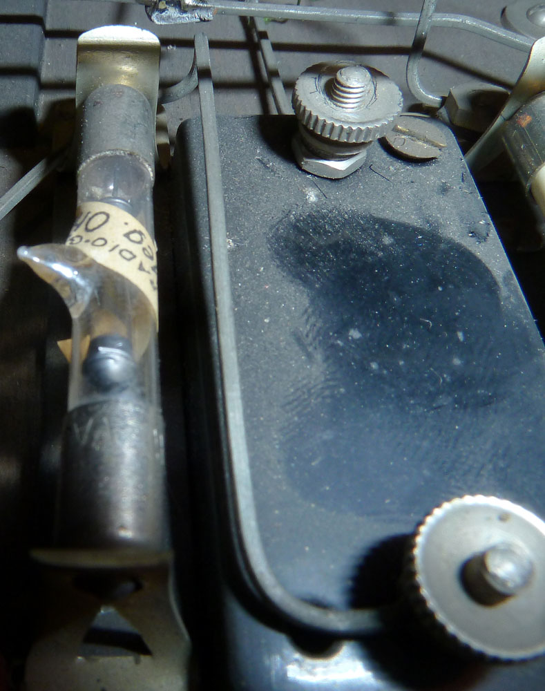 der Kopplungsgrad zwischen L2 und L3 kann von aussen mit dem mittleren Knopf eingestellt werden, dazu ist L3 schwenkbar. Neben dem unkonventionell geschalteten Schwingkreis fällt auch auf, dass es keine Abblock-Kondensatoren gibt. Neben den unerwünschten NF-Kopplungen über die Heizung gibt es ja noch den notwendigen HF-Pfad der Rückkopplung, der von C2 über die positive Betriebsspannung nach Masse fliessen muss, dazu gibt es nur den Weg über die (eher langen) Anschlusskabel und die Spannungsquelle. Auch der HF-Siebkondensator C6 am Gitter der Endstufe ist nicht auf Masse geschaltet, so dass die Verbindung nach Masse über das Anschlusskabel und die Batterie für die Gittervorspannung erfolgt. Aber es funktioniert...