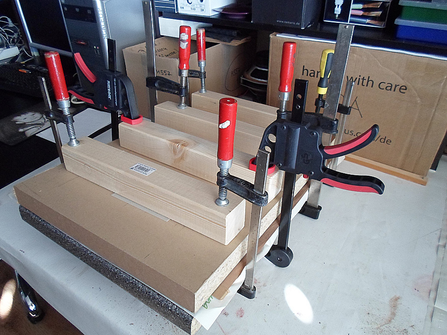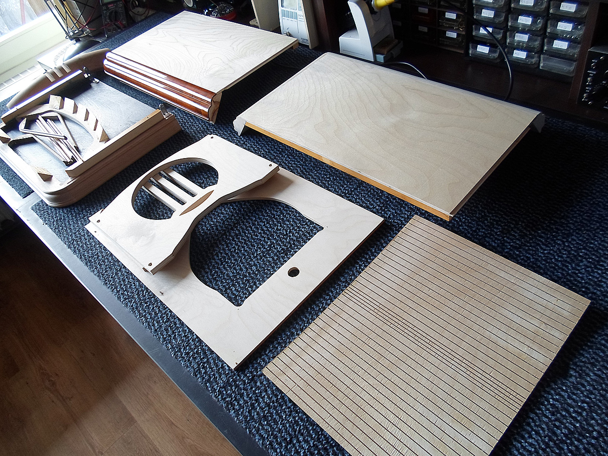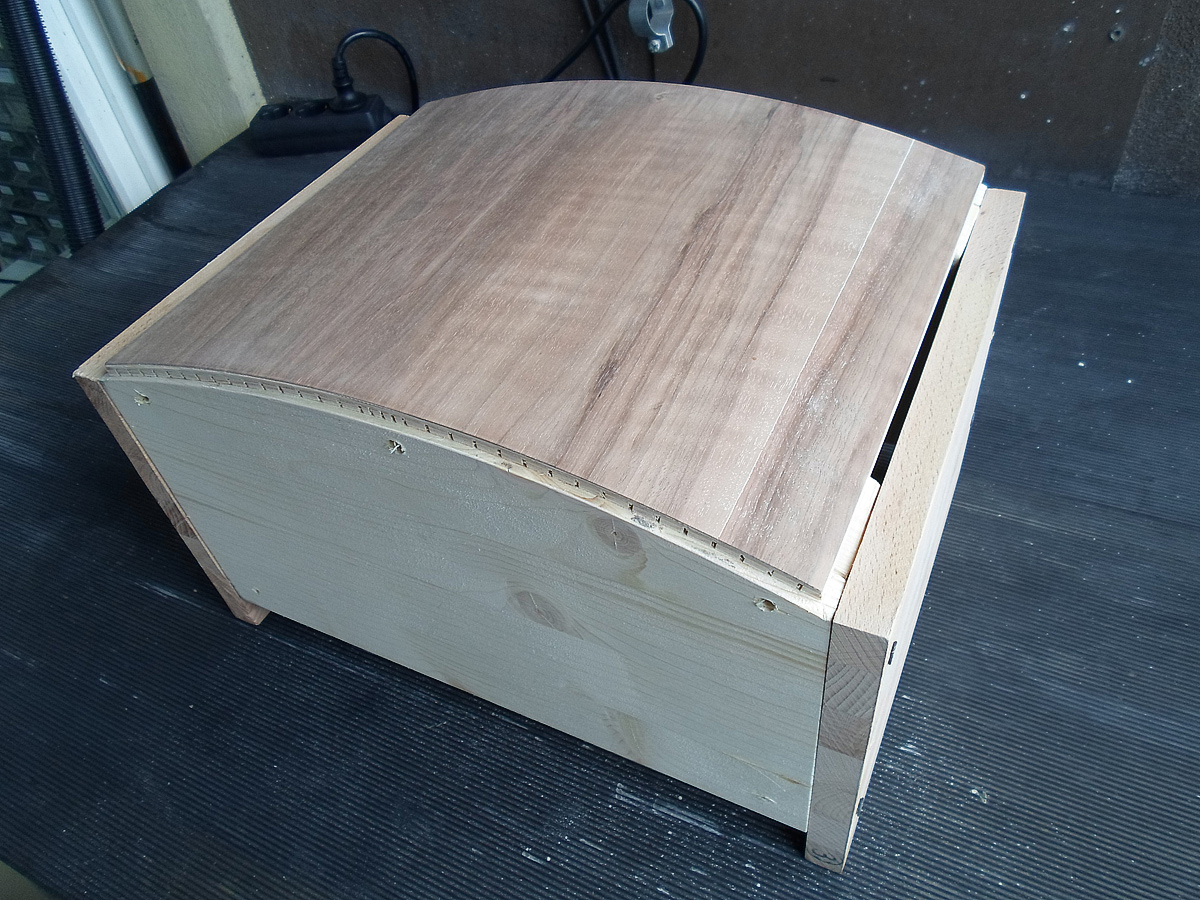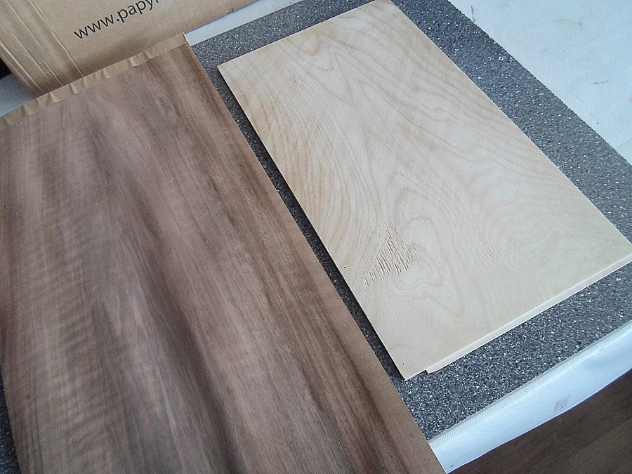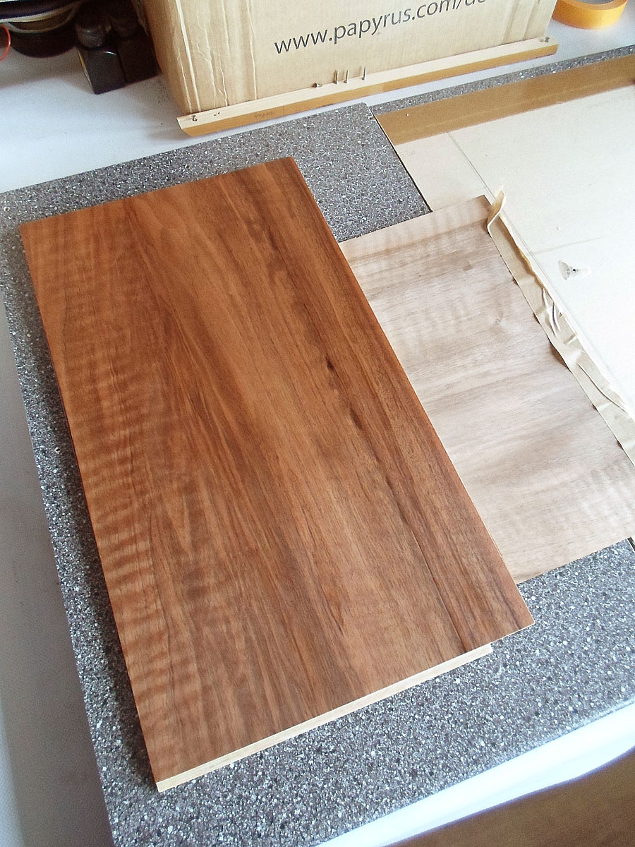 Wie schon erwähnt, die Arbeit mit dem Gehäuse lief parallel. Die Bauteile habe ich in Petersburg bestellt und als die kamen habe ich angefangen. Erst mal mit Furnier.