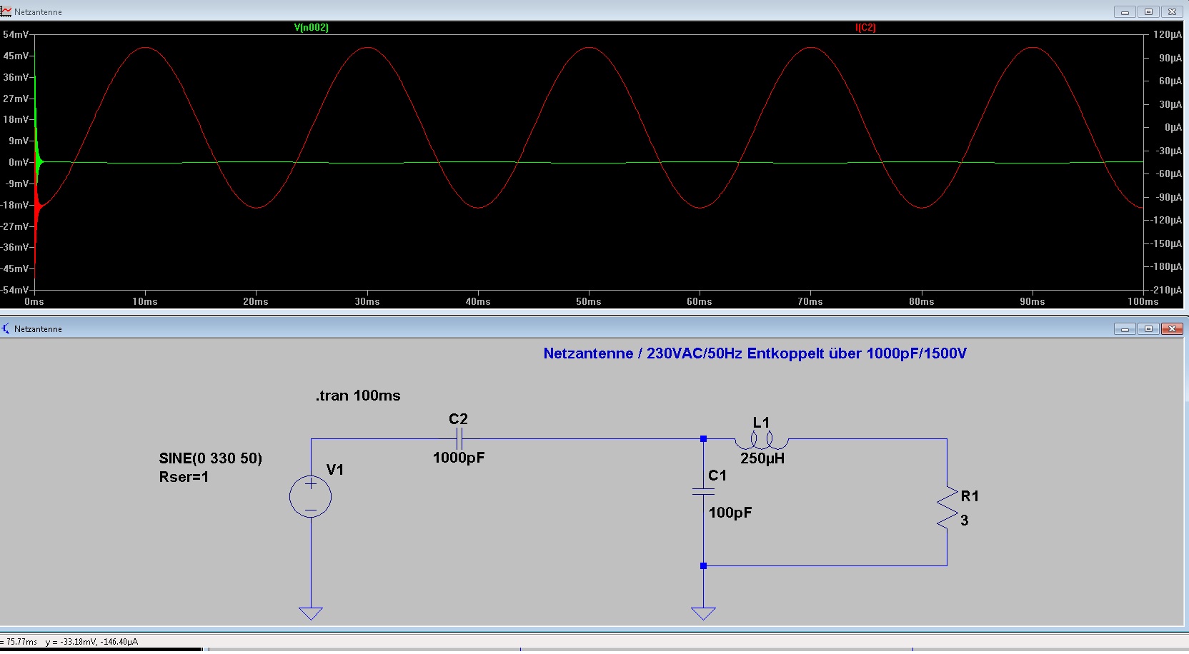 Hier mal eine Simulation mit 230VAC/50Hz...eigentlich dürfte nichts passieren. Beim Detektor würde ich aber die Finger von lassen, da ja ein Kopfhörer aufgesetzt wird. Das bekommt etwas von einem elektrischen Stuhl.