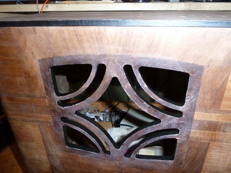 es geht weiter. Das Gehäuse hat auf der Oberseite eine neue Furnierplatte bekommen und die Kante oben sowie die Schnittkanten der Lautsprecheröffnung sind frisch gestrichen. Hier war eine ruhige Hand angesagt. zudem ein griffbereiter Lappen und Terpentin, falls doch mal Farbe am falschen Ort landet.