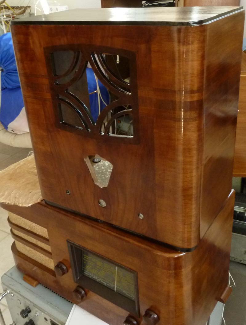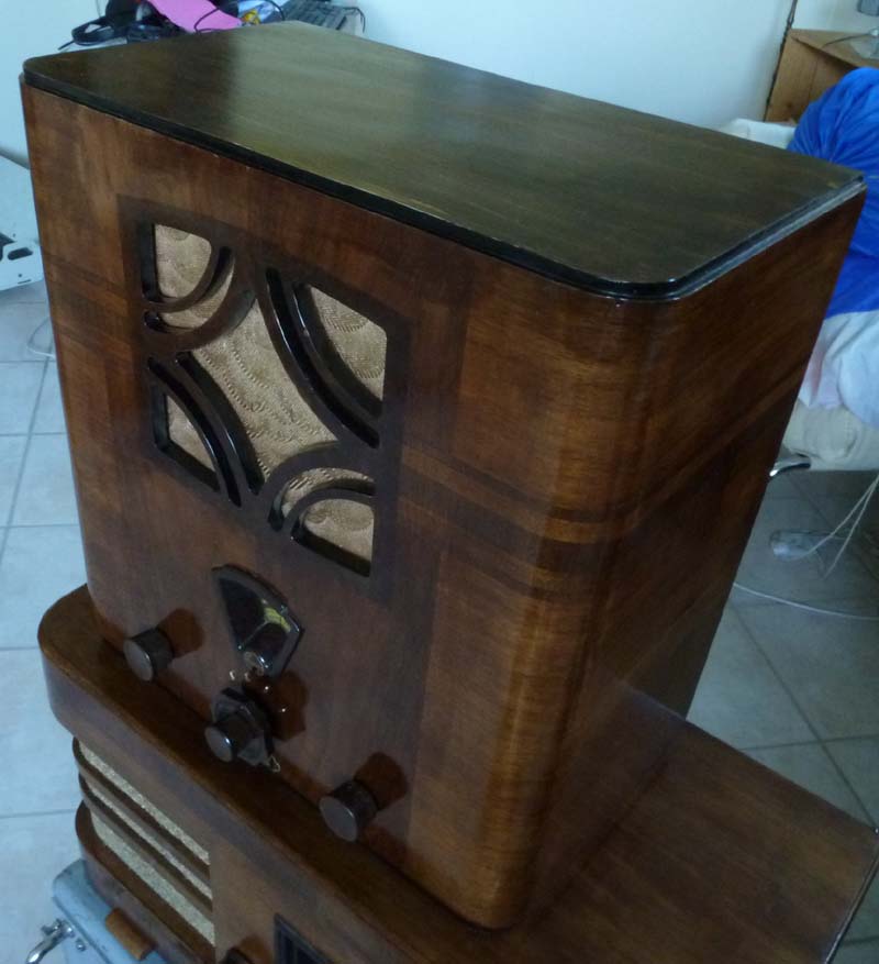 Hier das zusammengebaute Gerät, der Lautsprecherstoff hat ein paar kleine Schäden, aber ist dafür original, und die eingewebten Muster sind zu schade, um verlorenzugehen: