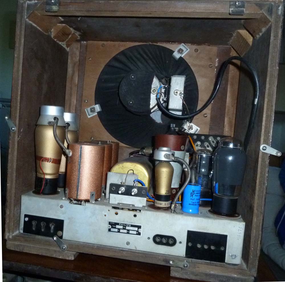 Bei diesen Versuchen habe ich auch festgestellt, dass der Empfänger auch HF abstrahlt, obwohl er ja gar keinen Oszillator hat. Einerseits gibt es in unmittelbarer Nähe des Empfängers ein magnetisches Feld des empfangenen Senders, was mit einer Ferritantenne sehr gut empfangen werden kann, andererseits erscheint das HF-Signal auch am Plattenspieleranschluss. Dort habe ich testweise mal den Biennophone angeschlossen. So wirkt der Philips als selektiver HF-Verstärker mit Vorregelung und der Biennophone macht den Rest, das ergibt ein 10-Kreis-Spitzensuper mit 5 geregelten Verstärkerstufen. Etwas übertrieben, aber gibt perfekte Schwundregelung und ist ein interessanter Versuch. So wird auch aus einem mässigen Transistorradio ein Spitzensuper, wenn man es auf den Philips stellt...