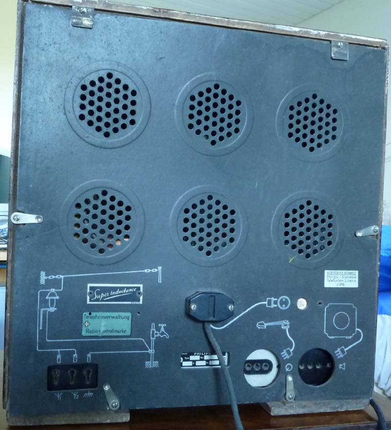 Hier noch die Rückwand. Interessant ist die Zeichnung der Antenne mit dem Überspannungsableiter. Ein neues stoffummanteltes Netzkabel ist bereits bestellt, das originale ist nicht mehr verwendbar.