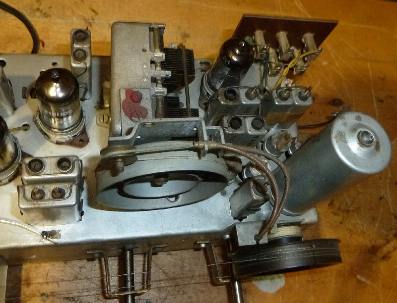 Hier noch der Abstimmantrieb. Dieser hat zwei Seile, das eine aus Stahl-Litze ist für den Skalenzeiger, das andere als Kunststoff für den Drehko-Antrieb mit den beiden Bowdenzügen.
