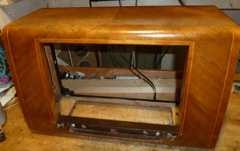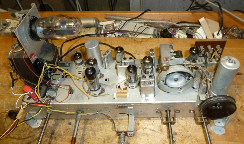 die Elektronik ist jetzt fertig restauriert. Der AM-Empfang ist sehr gut, und auf FM ist die Tonqualität und Empfindlichkeit auch gut, aber die ZF-Verstärkung ist knapp bemessen, so dass erst starke Sender laut empfangbar sind. Ich habe da mal alles durchgemessen, da ist kein Fehler drin, das war offensichtlich immer so. Die HF-Vorstufe verstärkt dabei ganz ordentlich, daher auch die durchaus gute Empfindlichkeit, aber für lautstarke Wiedergabe braucht es am Steuergitter der ECH42 halt schon ca. 1nV (die ist ja eigentlich auch nicht für UKW gedacht), was am Antenneneingang etwa 100uV erfordert. Mit einer Aussenantenne ist das für nicht allzu ferne Sender kein Problem, aber mit der integrierten Behelfsantenne ist er doch eher ein Ortsempfänger. Weiter ist die Störstrahlung vom Oszillator recht hoch, so etwa das 20fache eines neueren mit der ECC85, daher kann es durchaus auch mal Ärger geben, wenn man damit DAB+ stört. Aber als Zeuge der UKW-Anfangszeit ist er durchaus erhaltenswert, zumal mit dem Ratiodetektor eine einwandfreie Demodulation gegeben ist. Dank der AZ1 von Walterh (nochmals besten Dank) ist auch die Bestückung wieder originalgetreu.