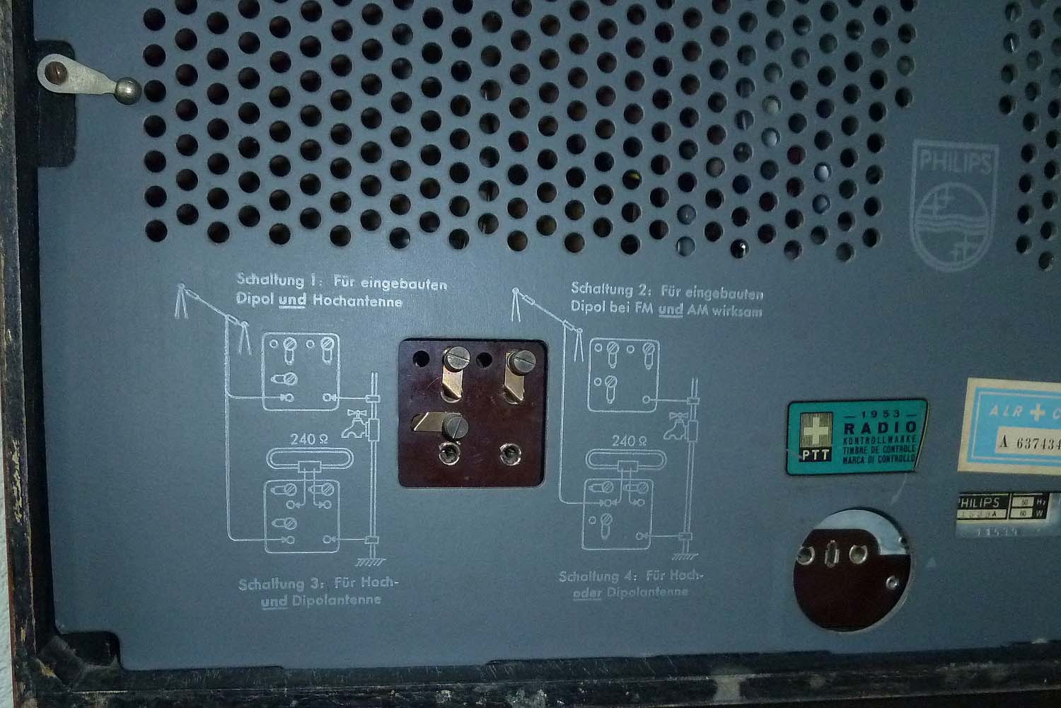 Im Gegensatz zu vielen anderen Geräten ist hier der interne UKW-Dipol fest an die oberen beiden Kontakte angeschlossen, welche bei Bedarf auf den UKW-Eingang geschaltet werden können.